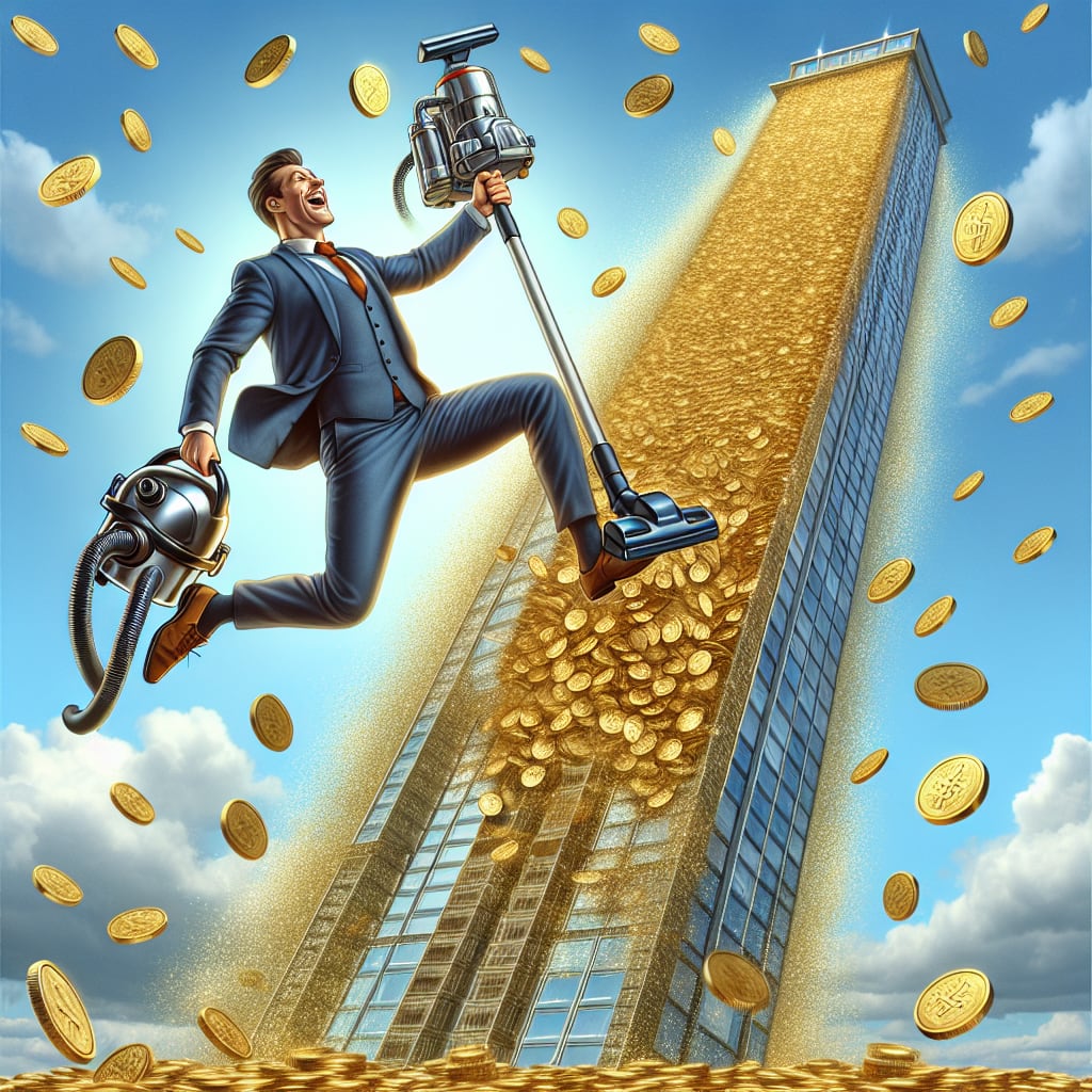 /showme a Vacuum cleaner billionaire jumping into a building full of gold coins