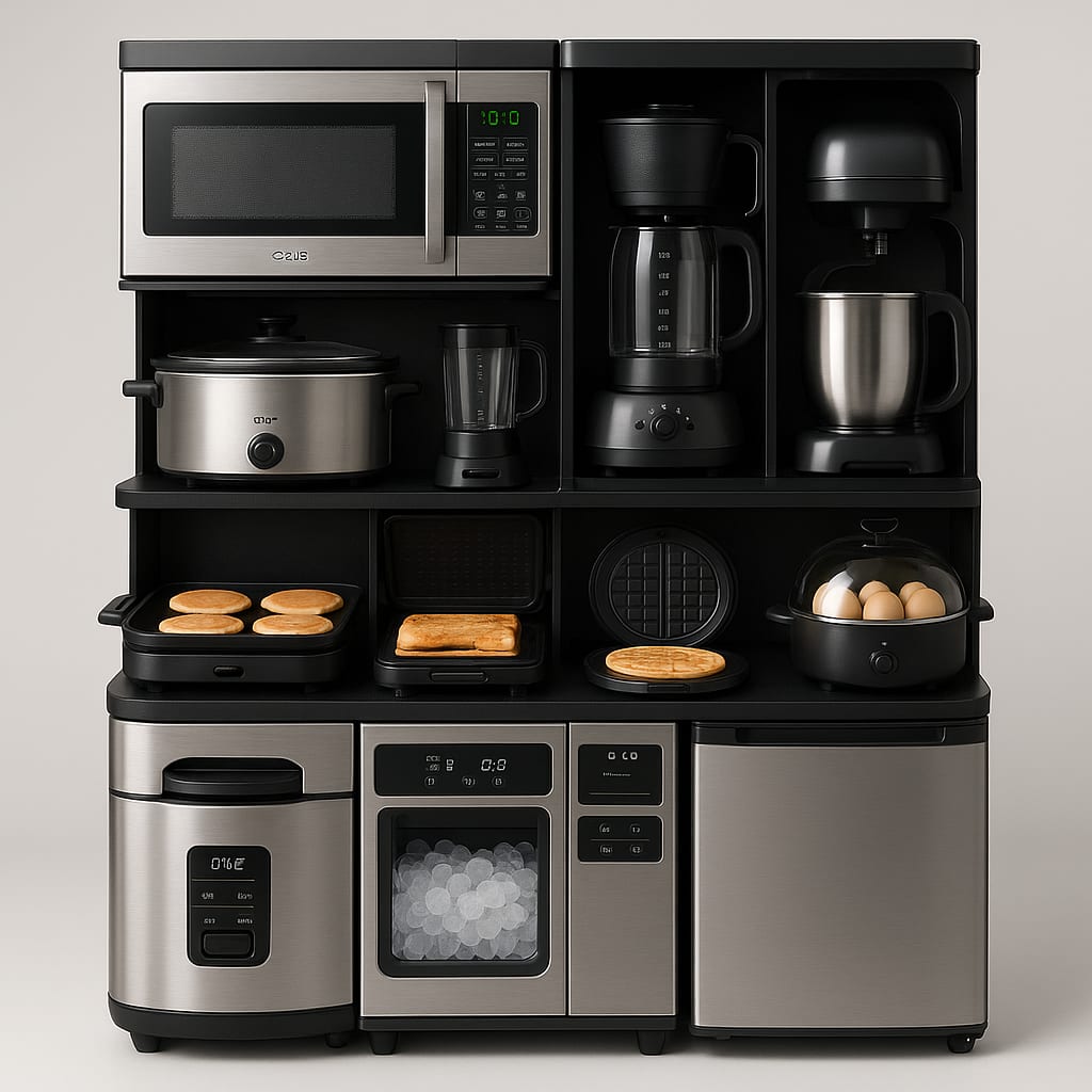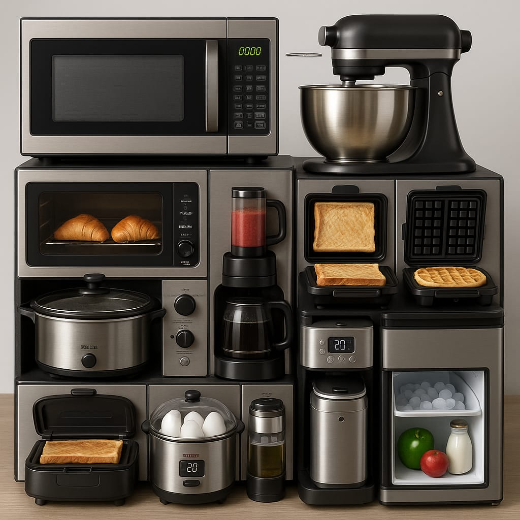 /showme a combination microwave, toaster oven, air fryer, slow cooker, coffee maker, blender, stand mixer, griddle, sandwich press, waffle maker, egg cooker, rice cooker, ice maker, and refrigerator.