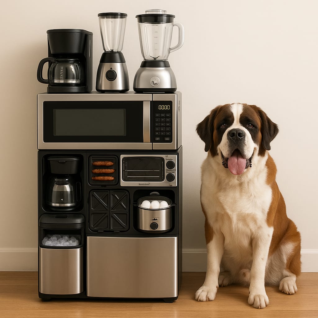 /showme a one-unit combination microwave, toaster oven, air fryer, slow cooker, coffee maker, blender, stand mixer, griddle, sandwich press, waffle maker, egg cooker, rice cooker, ice maker, and refrigerator that’s smaller than an adult St.Bernard