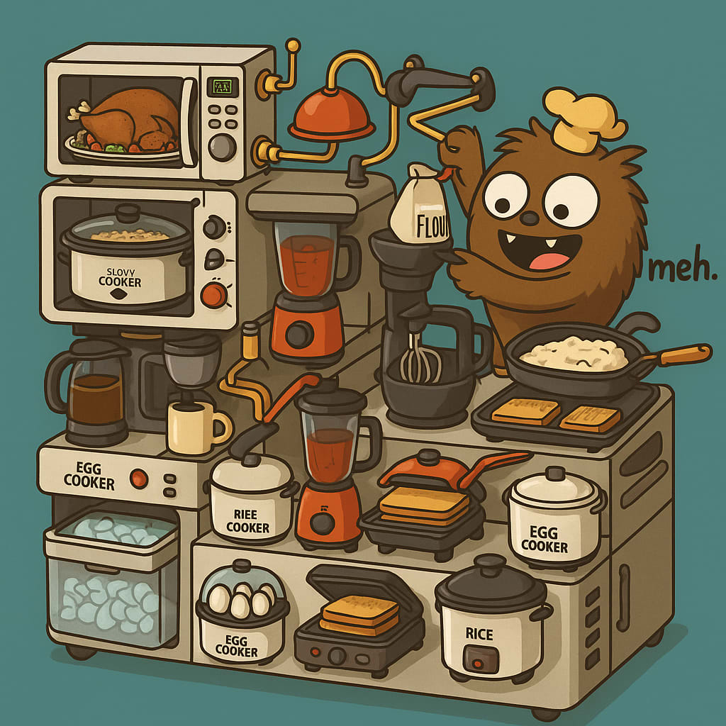 /showme a rube goldberg all in one machine with microwave, toaster oven, air fryer, slow cooker, coffee maker, blender, stand mixer, griddle, sandwich press, waffle maker, egg cooker, rice cooker, ice maker, and refrigerator roughly the size of a St.Bernard being used by IRK, the playful mascot of meh.com to cook a thanksgiving feast