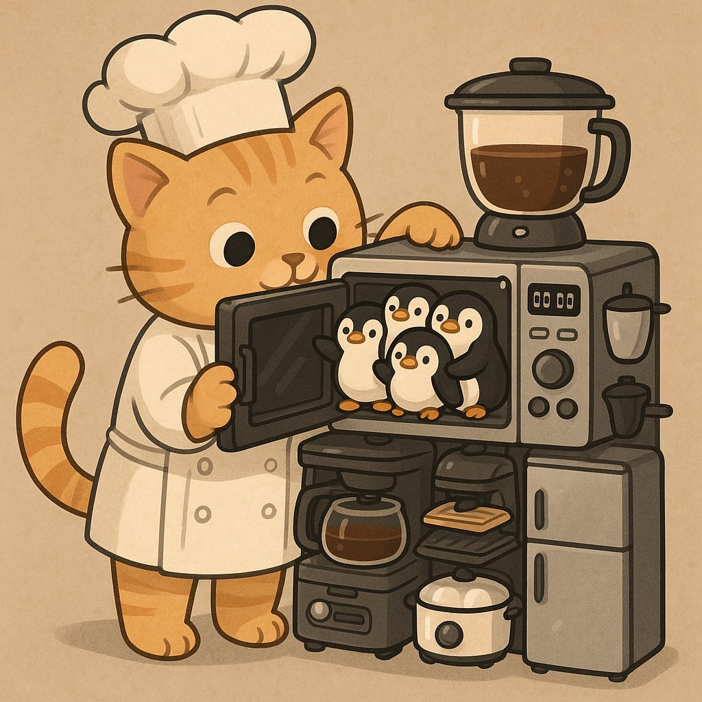 /showme a cat chef putting multiple penguins into a compact one-unit combination microwave, toaster oven, air fryer, slow cooker, coffee maker, blender, stand mixer, griddle, sandwich press, waffle maker, egg cooker, rice cooker, ice maker, and refrigerator.