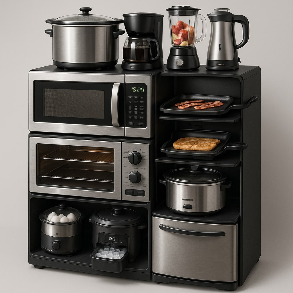 /showme a one-unit combination microwave, toaster oven, air fryer, slow cooker, coffee maker, blender, stand mixer, griddle, sandwich press, waffle maker, egg cooker, rice cooker, ice maker, and refrigerator.