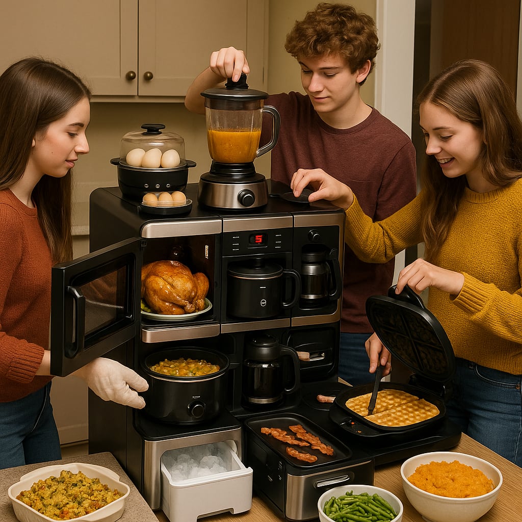 /showme a one-unit combination microwave, toaster oven, air fryer, slow cooker, coffee maker, blender, stand mixer, griddle, sandwich press, waffle maker, egg cooker, rice cooker, ice maker, and refrigerator that’s smaller than an adult St.Bernard, that’s currently being used by teenaged humans to make a Thanksgiving meal