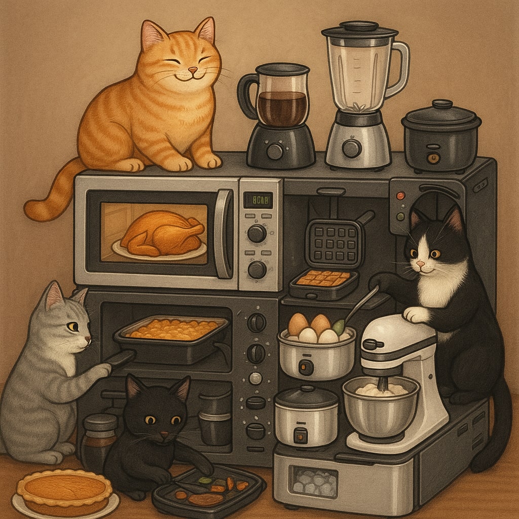 /showme a compact one-unit combination microwave, toaster oven, air fryer, slow cooker, coffee maker, blender, stand mixer, griddle, sandwich press, waffle maker, egg cooker, rice cooker, ice maker, and refrigerator that’s smaller than an adult St.Bernard being used by cats to make a Thanksgiving meal