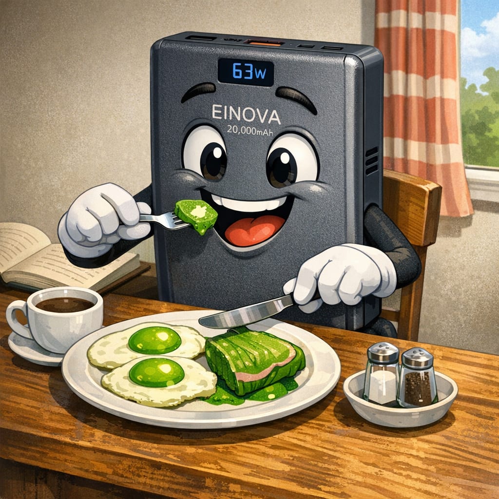 /showme Anthropomorphized Einova 63W 20,000mAh Power Bank is eating green eggs and ham.