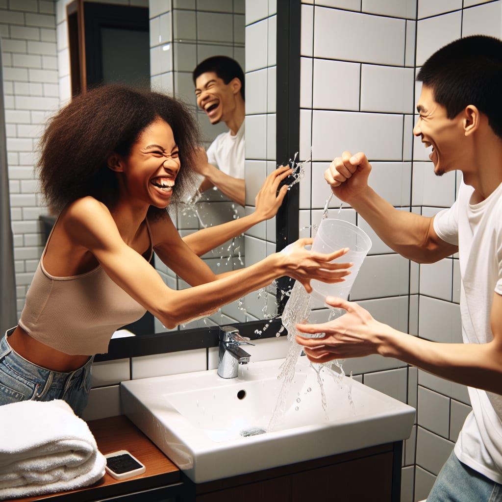 /showme couple having a water fight in the bathroom