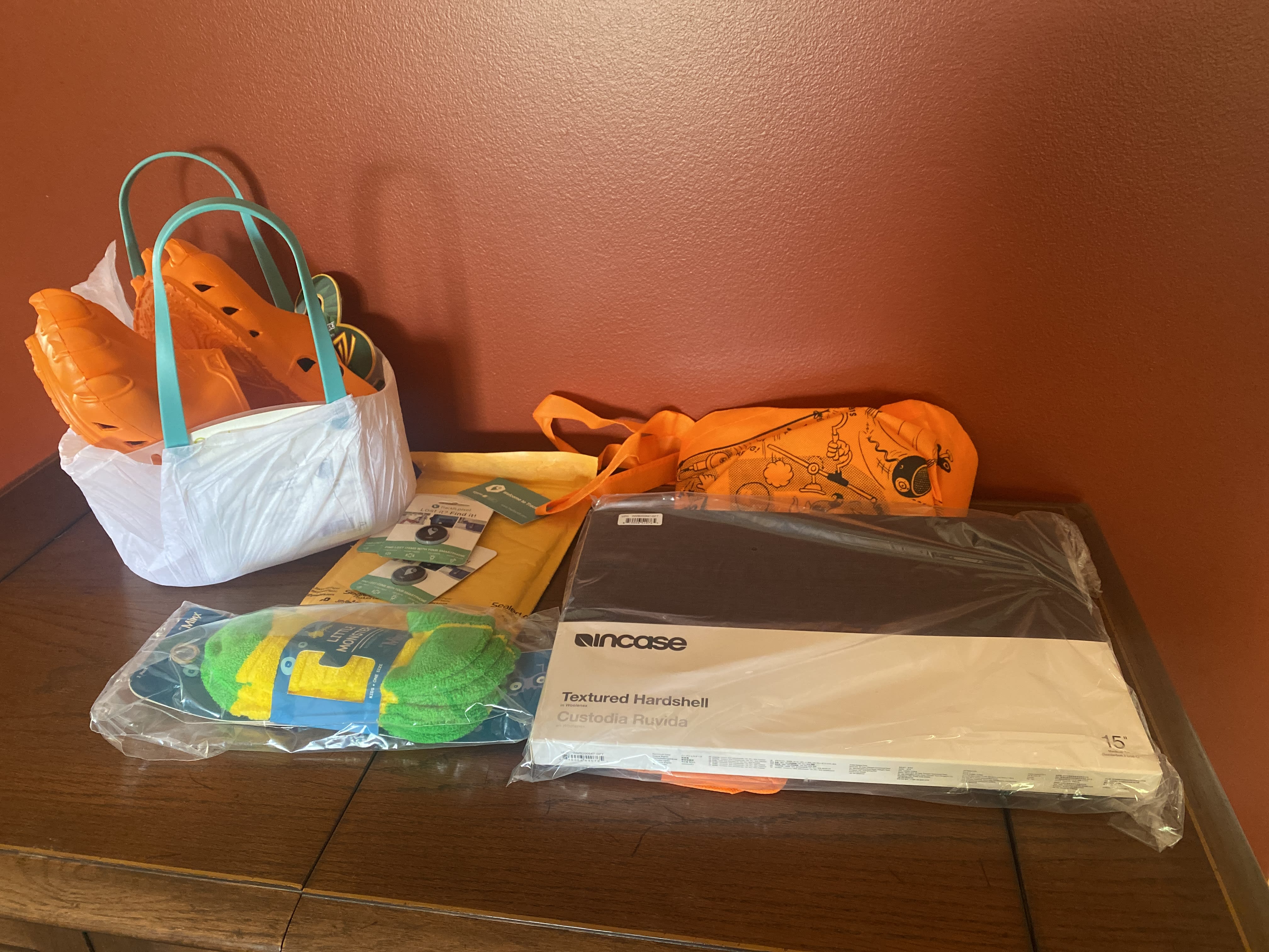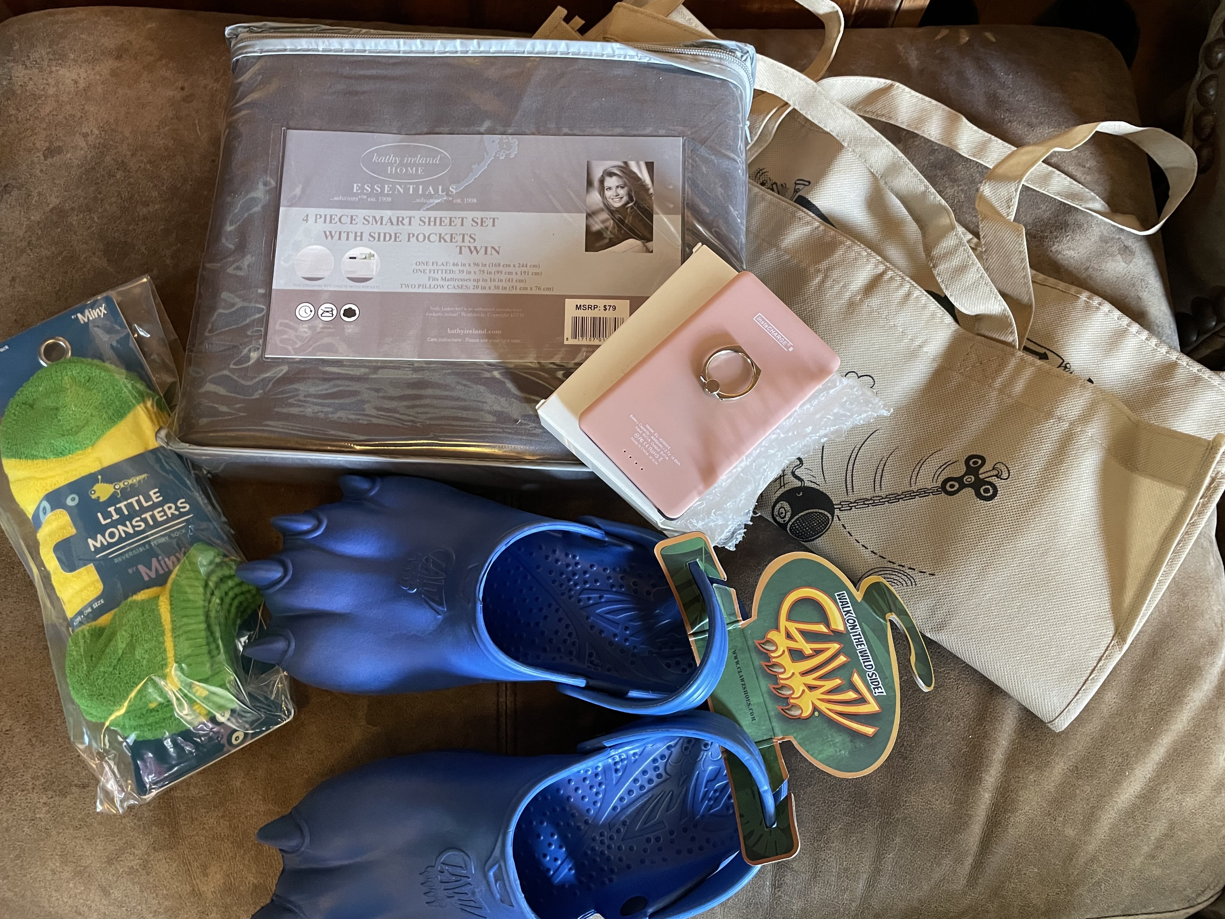 Socks and putty went to daughter, fry pan and charger went to wife. Orange bag went to storage bin in garage. Wife may hit me with the pan if I keep buying these.