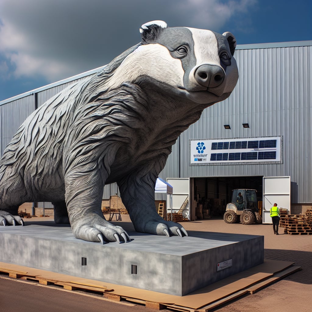 /showme a lifesize concrete badger statue being powered by solar and a battery outside a meh warehouse ready to sell in tomorrow’s deal.