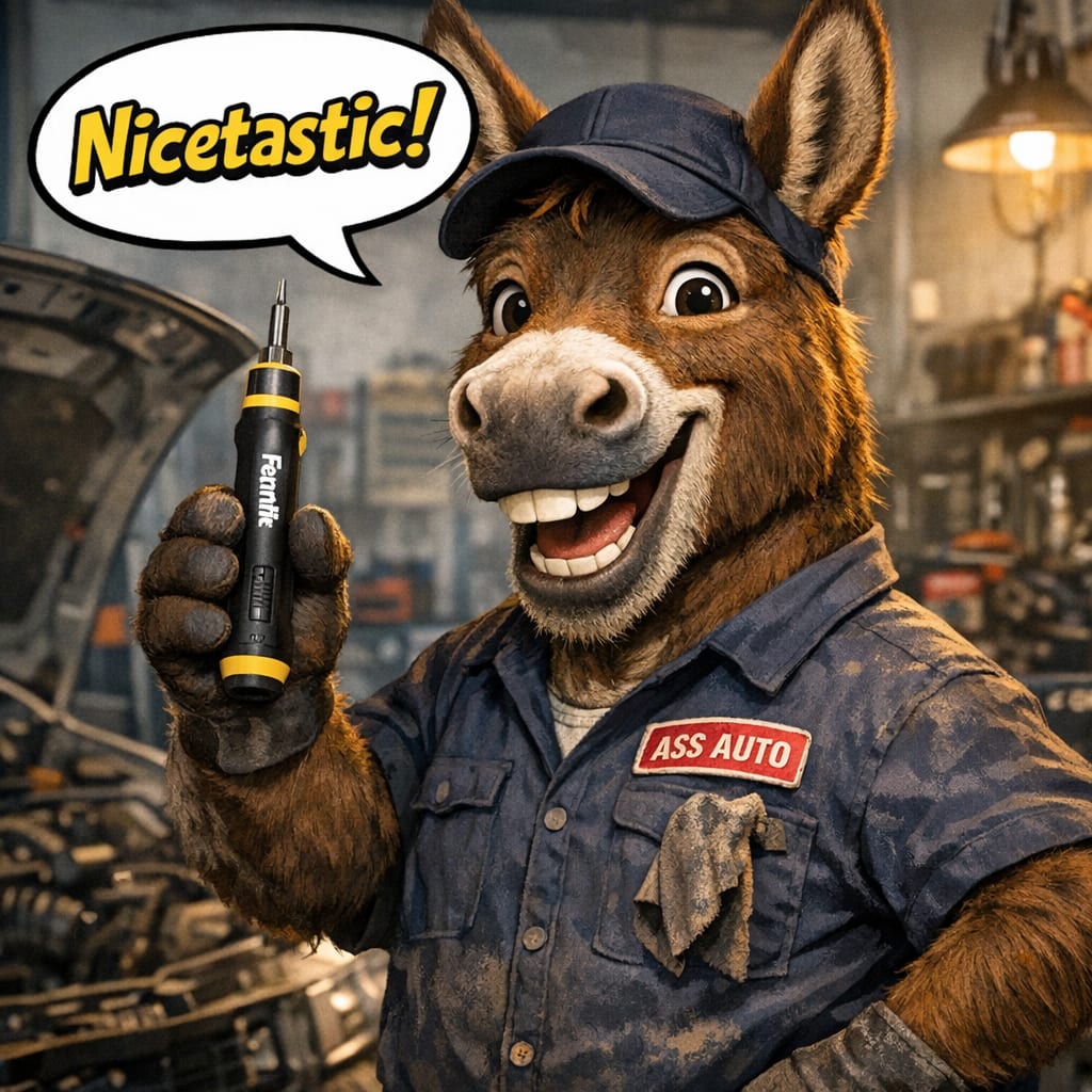 @phendrick Here’s the image you requested for “an ass admiring this Fanttik screwdriver and a car mechanic saying fantastic”