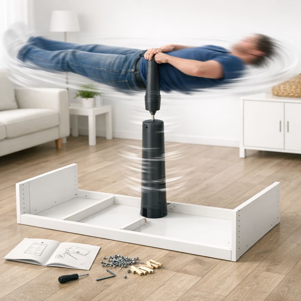 /showme vertical handheld dark grey cylinder shaped battery powered screwdriver, powerfully spinning the user horizontally like a propellor above a partially assembled Billy bookcase on the floor, ikea catalog style with motion blur.