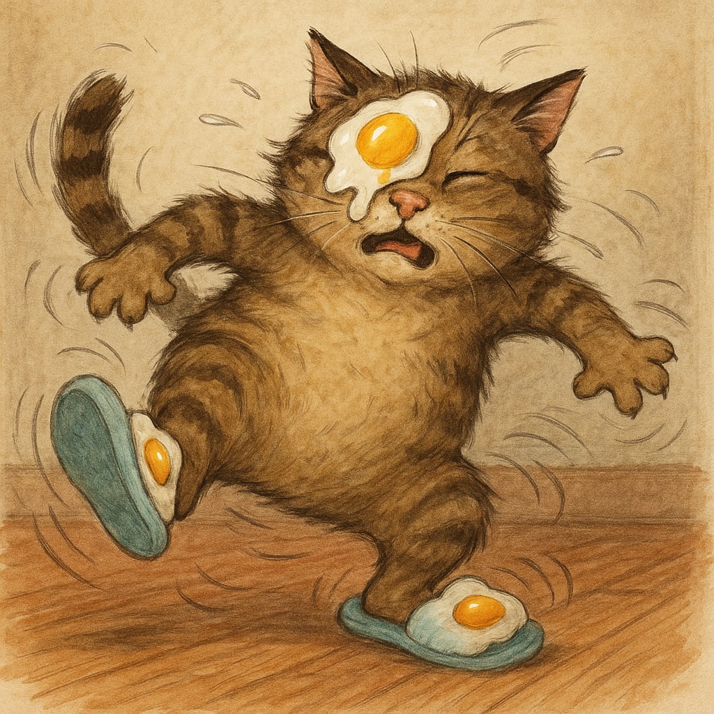/showme a drunk cat slipping all over the place while wearing slippers with egg on its face