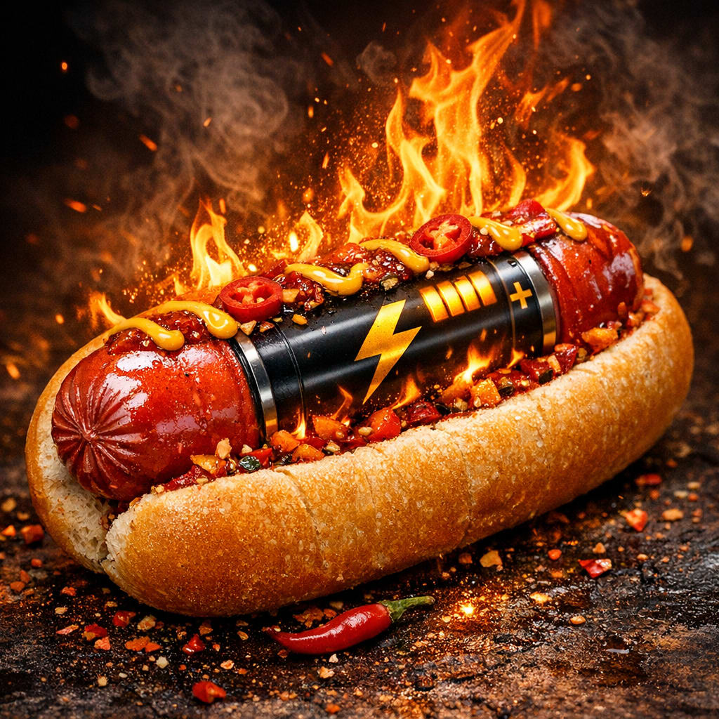 @cfg83 Here’s the image you requested for “spicy fiery battery that is shaped like hot dog in a bun.”