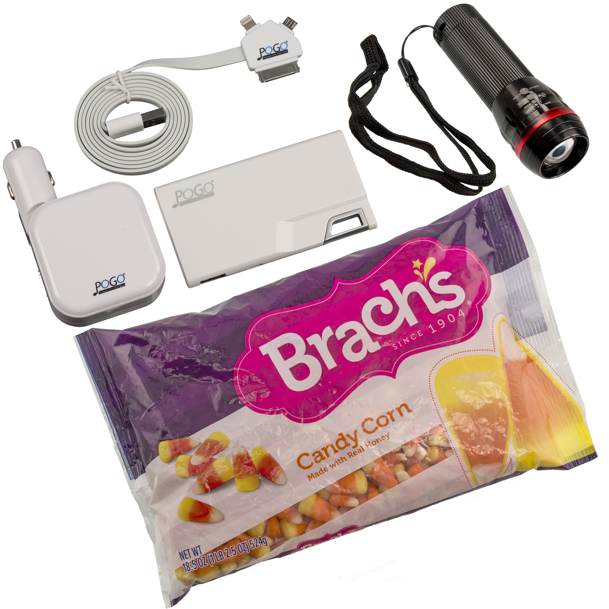 Specs ====- Flashlight: - Model: POGO-5W-200 - Condition: New - Shines light so you can see in the dark - Three modes: Bright, Really Bright, and Flashing- Candy Corn: - Condition: New - Ingredients: sugar, corn syrup, confectioner’s glaze, salt, honey, dextrose, artificial flavor, gelatin, titanium dioxide color, yellow 6, yellow 5, red 3, blue 1, sesame oil - Total carbohydrates: 36g (12% daily value) - Sugars: 32g - Sodium: 70mg (3% daily value) - Calories: 140 - Best If Sold By January 2018- Power Bank: - 1 Meter combo cable: USB to Lightning, Micro USB, and 30-Pin - Wall & Car Charger: 2x USB with DC5V/2.1A max output - Power bank: 1A Output, 2800mAh outputWhat’s in the Box? ====1x Flashlight1x Bag of candy corn1x Car/Wall charger1x Powerbank1x Combo cablePictures====JunkFlashlightCharger stuffCandy CornFlashlightFlashlightFlashlight flashy endGlowing redBatteryPower bankChargerFolded up chargerBoxBag