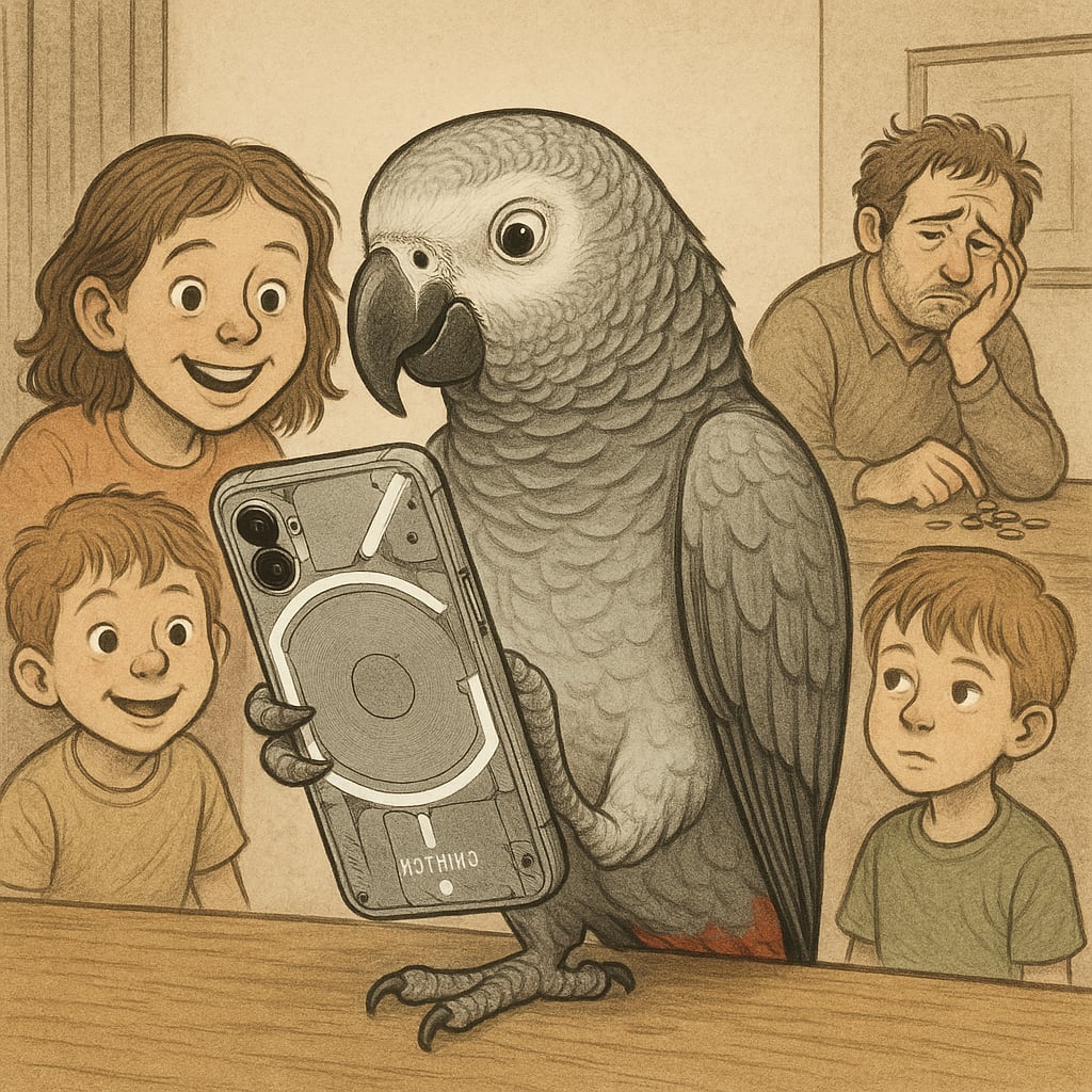 /showme An African Grey Parrot using a smart phone called a “Nothing Phone”. Two kids are looking at the African Grey Parrot adoringly and a third kid is staring off into the distance. Sad parent is in the background counting pennies.