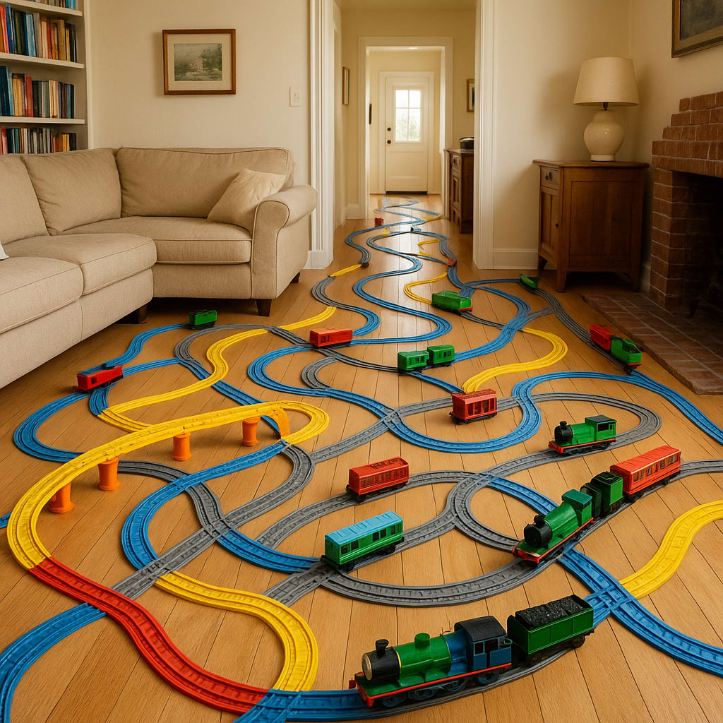 /showme a house full of toy trains running on the floor EVERYWHERE.