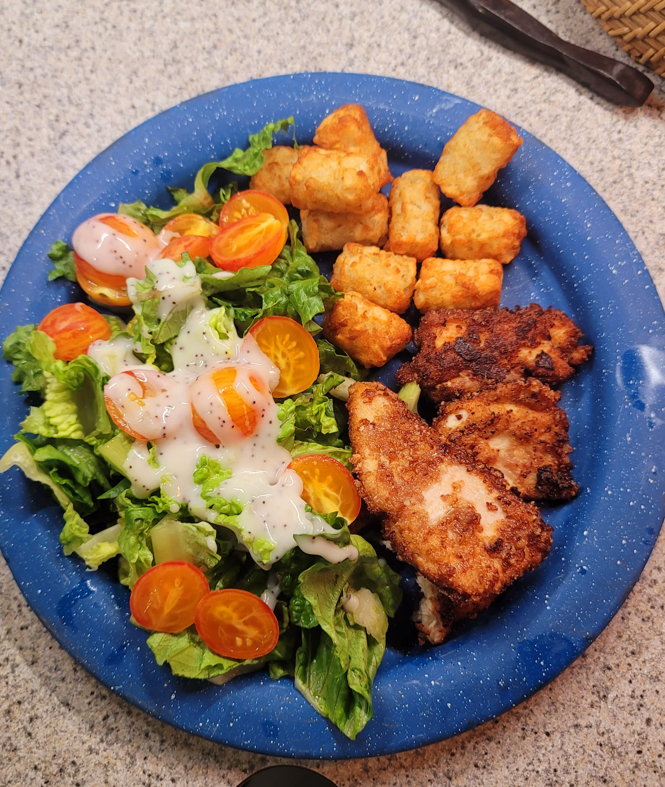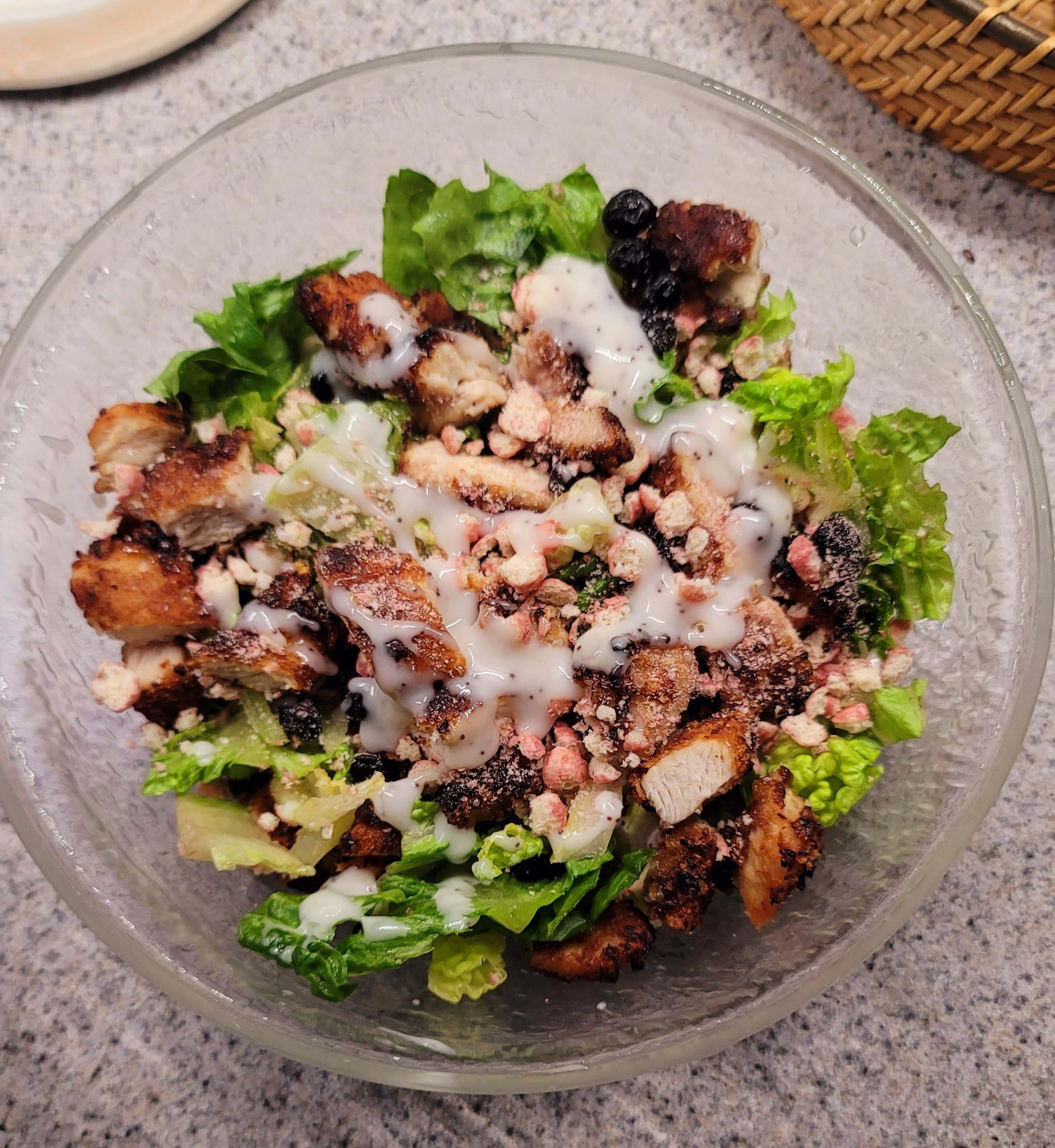 @Kyeh @tinamarie1974 well, no spinach but I did do romaine, dried blueberries and some crushed cereal as croutons. Tomatoes were not quite ready today.