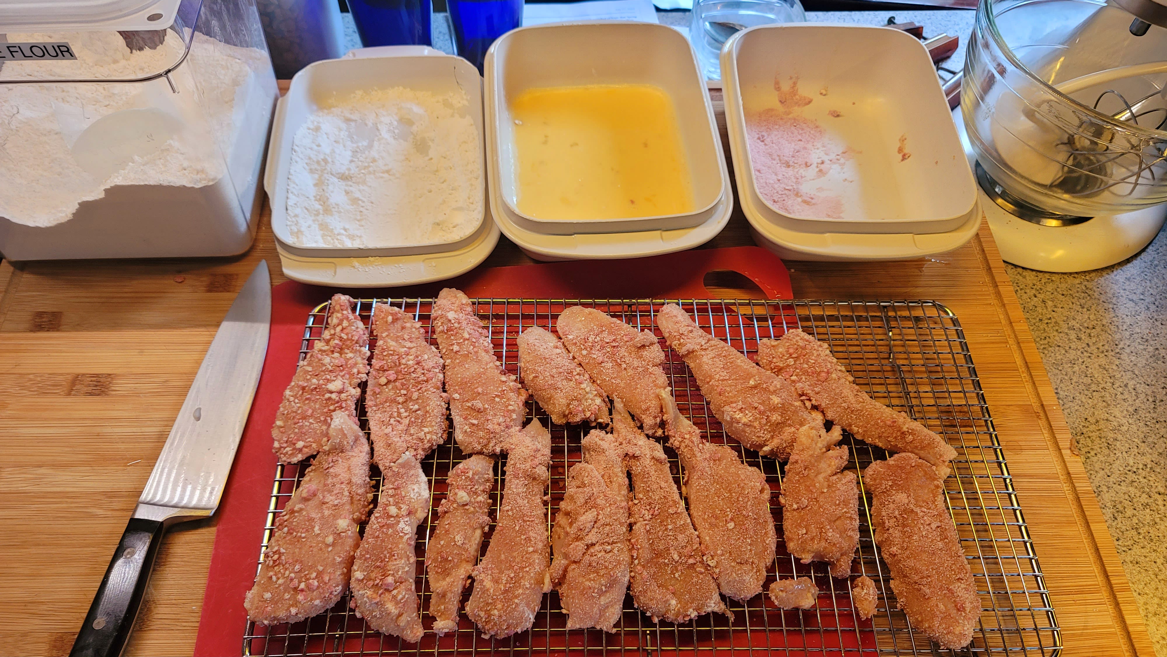 So I thought, why not crush it up and use it to coat chicken? Strawberry is good with chicken and I’ve used cereal before for a coating. This could be good.
