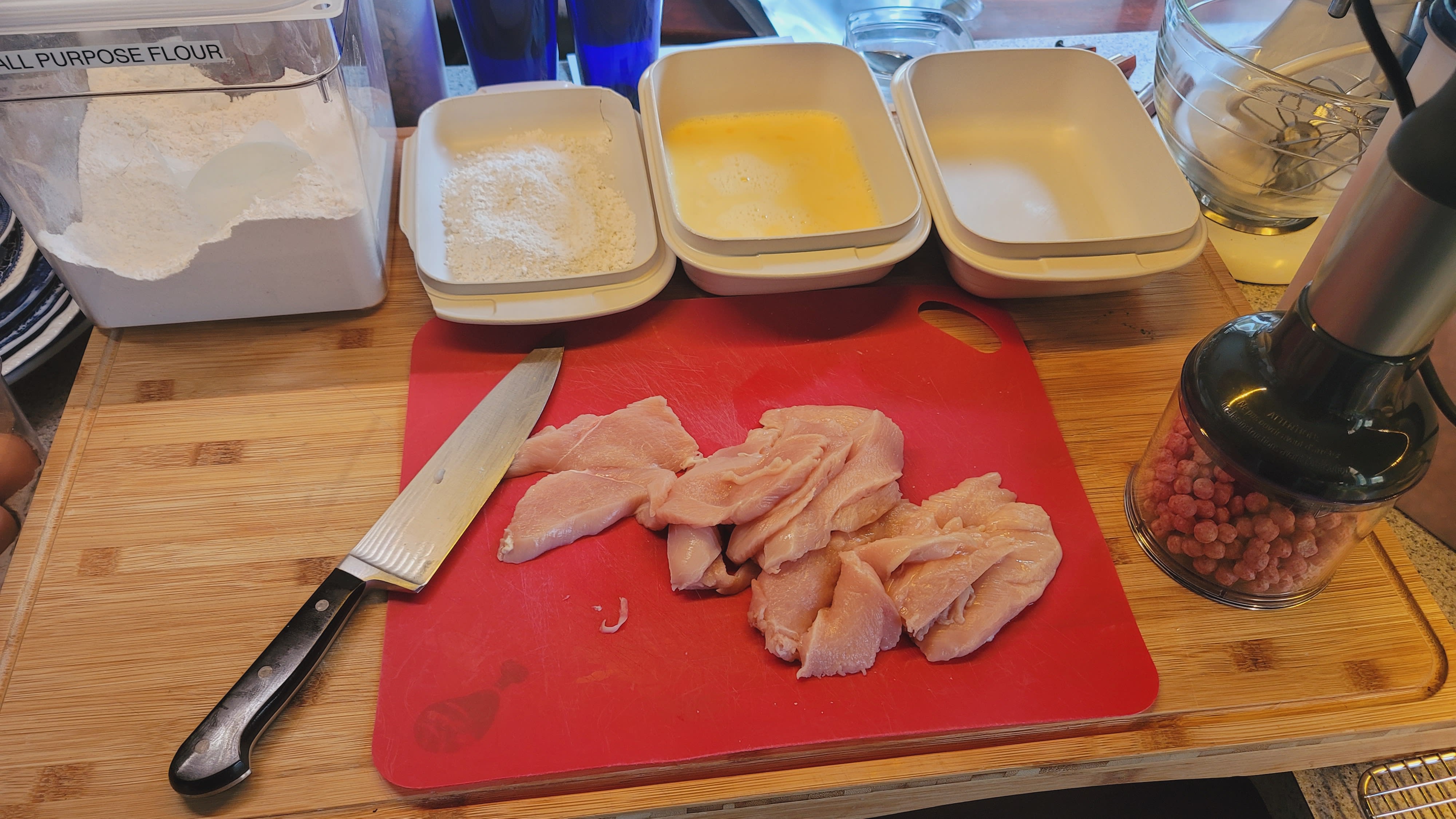 First I cut the chicken into strips. You can pound it if you like. You just want them to be relatively even and about 1/2" thick