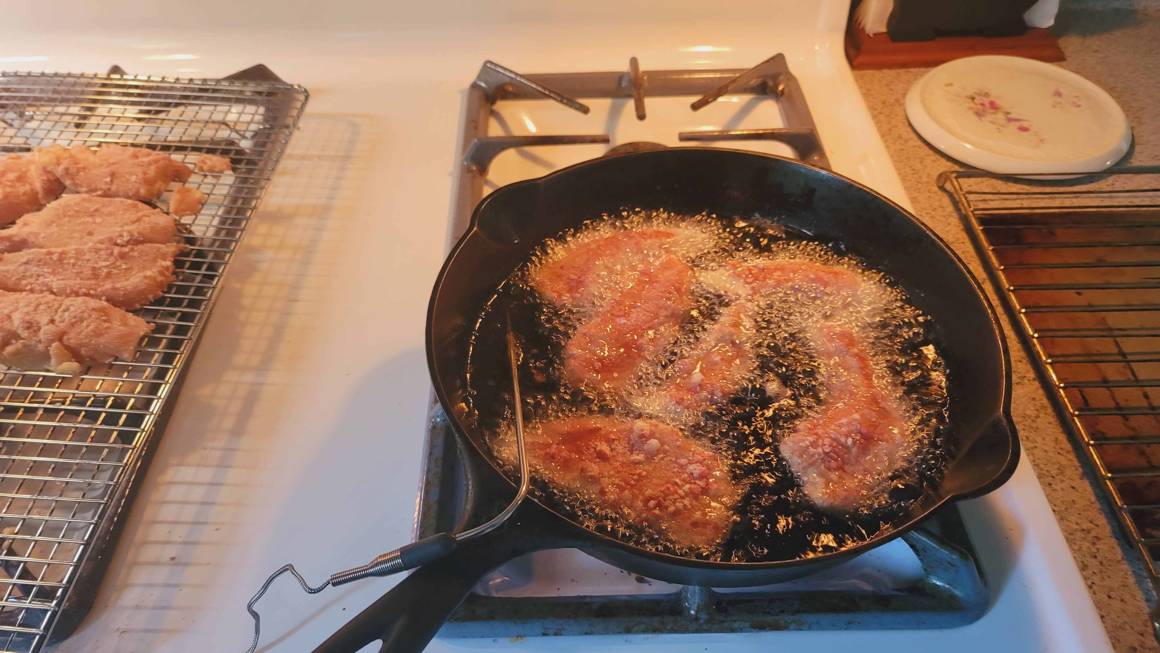 A digital probe thermometer (didn’t we see one somewhere? ) is helpful to both keep track of oil temp and the temp of the chicken.