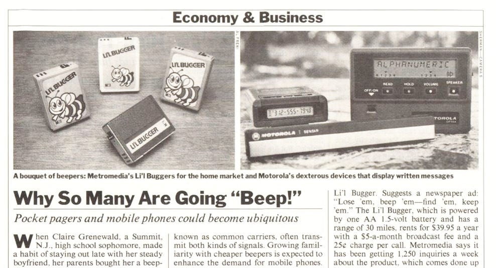 In the same story, a different ad exec says, “Paging’s like long distance. That was once used primarily on an occasional or emergency basis; today, you call California to say hello or talk about the weather. It’s this promiscuous use that we’re convinced exists for paging. We’re going to promote it as an everyday extension of the phone, a natural way to stay in touch.”