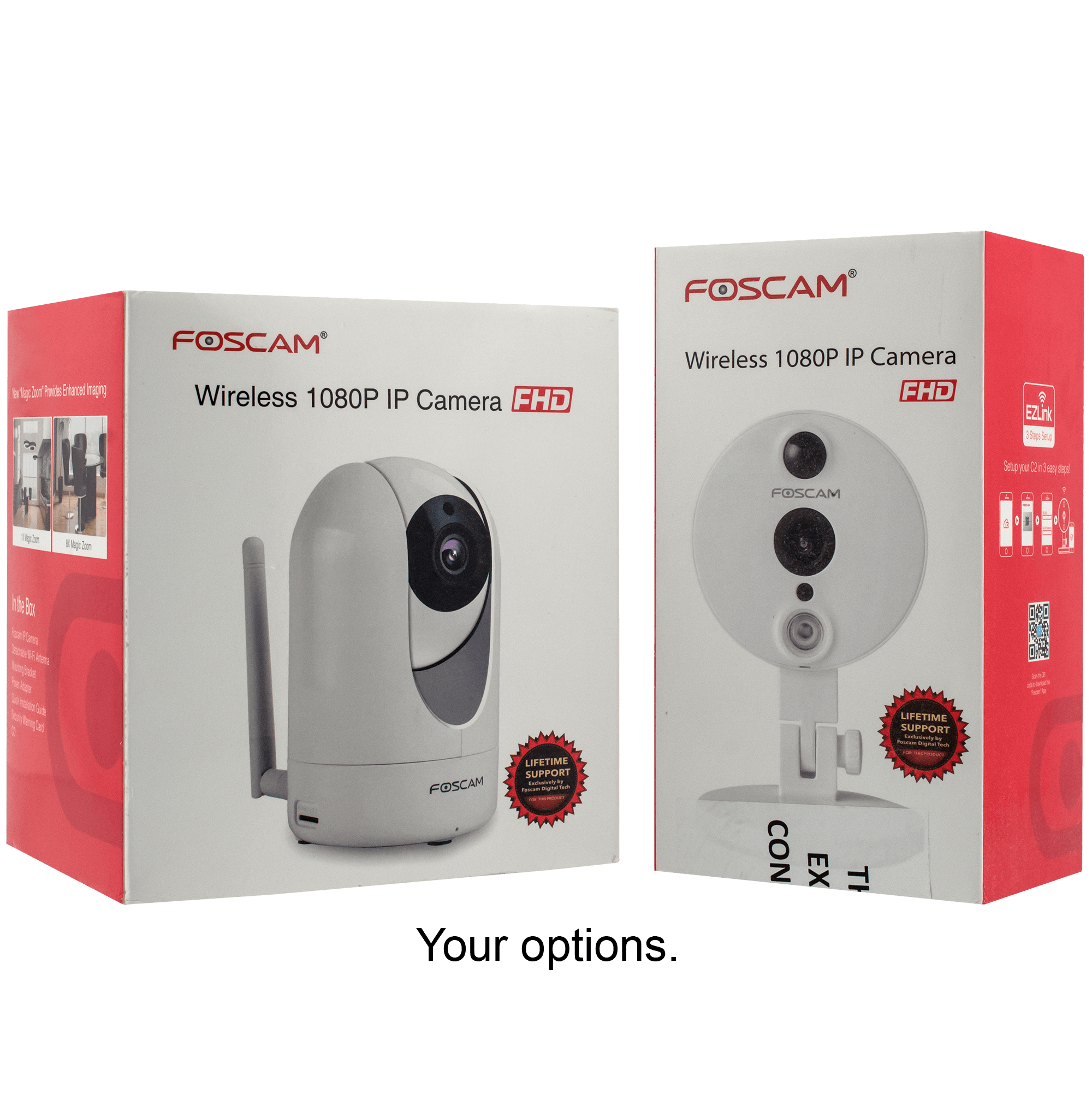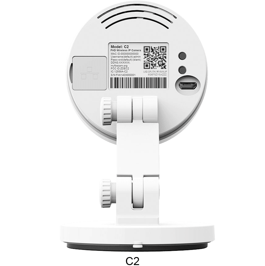 Specs ====|Model:|R2|C2||—|—|—||Condition:|Refurbished|Refurbished||Sensor Type:|1/3" CMOS|1/3" CMOS||Display Resolution:|1920 x 1080 (2.0 Megapixel)|1920 x 1080 (2.0 Megapixels)||Frame Rate:|25fps|30fps||IR CUT:||||Minimum Illumination:|0 Lux (With IR Illuminator)|0 Lux (With IR Illuminator)||Lens Type:|f:2.8mm; F:2.4|f:2.8mm,F:2.4||Motorized Pan/Tilt:||N/A||Diagonal Angle Of View:|110|120||Horizontal View Angle:|95(Pan/Tilt Angle: H=300V=100)|110||IR Range:|26.2 feet|26.2 feet||Ethernet:||||Wps:||||Wireless:|IEEE802.11b/g/n|IEEE802.11b/g/n||Wireless Security:|WEP, WPA, WPA2|WEP, WPA, WPA2||P2P:||||External Card Slot:|micro SD card|micro SD card||Video Format:|H.264|H.264||Multi Stream:|Dual stream|Dual stream||Motion Detection:||||Scheduled Recording:||||Built In Ddns Server:||||Browser Supported:|IE8 and above, Firefox, Chrome, Safari|IE8 and above, Firefox, Chrome, Safari||Os Supported:|Windows XP, 7, 8; Mac OS; iOS, Android|Microsoft Windows XP, 7, 8;Mac OS;iOSAndroid||Infrared Mode:|Automatic or manual|Automatic or manual||Night Vision:||||Firewall:|Supports IP Filtering|Supports IP Filtering||2 Way Audio:||||Built In Microphone:||||Built In Speaker:||||Dimensions(mm):|70 x 70 x 120|70 x 70 x 120||Power Adapter:|5V/2.0A|5V/1.0A||Power Consumption:|< 4.8W|< 4.8W||Operate Temperature:|14F ~ 122F|14F ~ 122F||Operating Humidity:|20% ~ 85% non-condensing|20% ~ 85% non-condensing|What’s in the Box? ====1x Camera1x Power supply1x Mounting bracket/hardware1x AntennaPictures====BoxesR2Included with R2C2C2 looking upIncluded with C2R2 looking upR2 looking forwardBack of R2Back of C2C2 from the ceilingR2C2Price Comparison====R2: $129.99 List, $99.99 at AmazonC2: $119.99 List, $102.90 at AmazonFind a relevant price comparison? Please share it in a comment in this thread