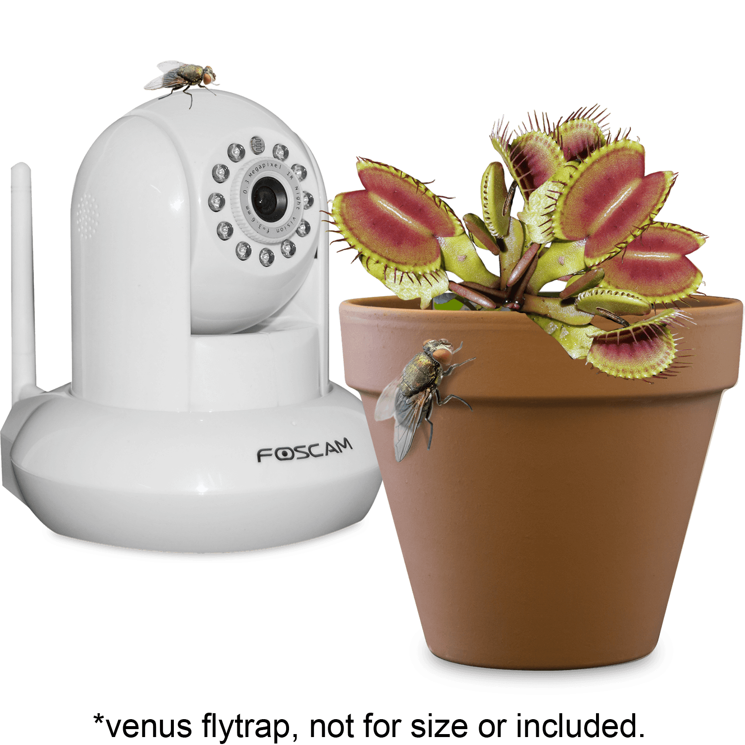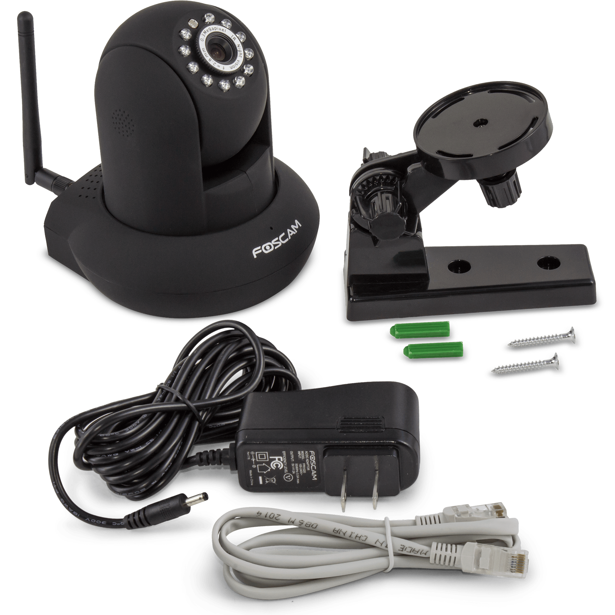 Specs ==== - Model: FI8910W - Dimensions: 8" x 5" x 6.5"- Wireless standards: IEEE 802.11b/g/n - Pan/Tilt: 300/120 - Viewing angle: 60 Degree - Sensor: CMOS Sensor - Resolution: 640 x 480 - Lens: f: 2.8mm, F:2.4 (IR Lens) - Night visibility up to 26 ft.- Mini lumination: .5Lux - Audio compression: ADPCM - Image compression: MJPEG - Framerate: 15fps (VGA), 30fps (QVGA) - Security: WEP, WPA, WPA2 - Windows XP, Vista, 7, 8, Mac OS, and Linux Manufacturer specsCondition: RefurbishedWarranty: 1 Year Limited FoscamEstimated Delivery: 4/13 - 4/15Shipping: $5 or free with VMP What’s in the Box? ==== 1x Foscam Wireless IP Camera 1x Wifi Antenna 1x User Manual 1x Mounting Bracket 1x Network Cable 1x DC Power Supply 5V Pictures ==== BlackWhiteCamera w/ AccessoriesRemote mobile viewingThe back of the unitChecking in on your pet Venus flytrapPrice Check ==== $56.00 at Amazon (New). Note that the top review about the camera freezing if pointed at a too-detailed scene is an old issue that has since been fixed. This stock is of current models and has been recently tested to prevent those problems. $159.99 List, $64.99 at Foscam