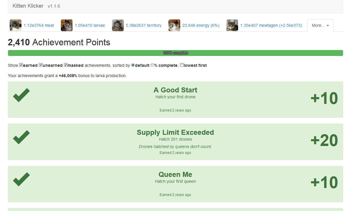Just thought I’d check in. Started last October (must’ve been around the 1-year updates that started coming in). Currently playing on 3 devices (laptop, desktop, phone). Main has 13 ascensions, highest critter is Overmind VI (repeats once you get to Overmind and the upgrades are no longer as proportional as before). Currently earning 6.67e1237 meat.