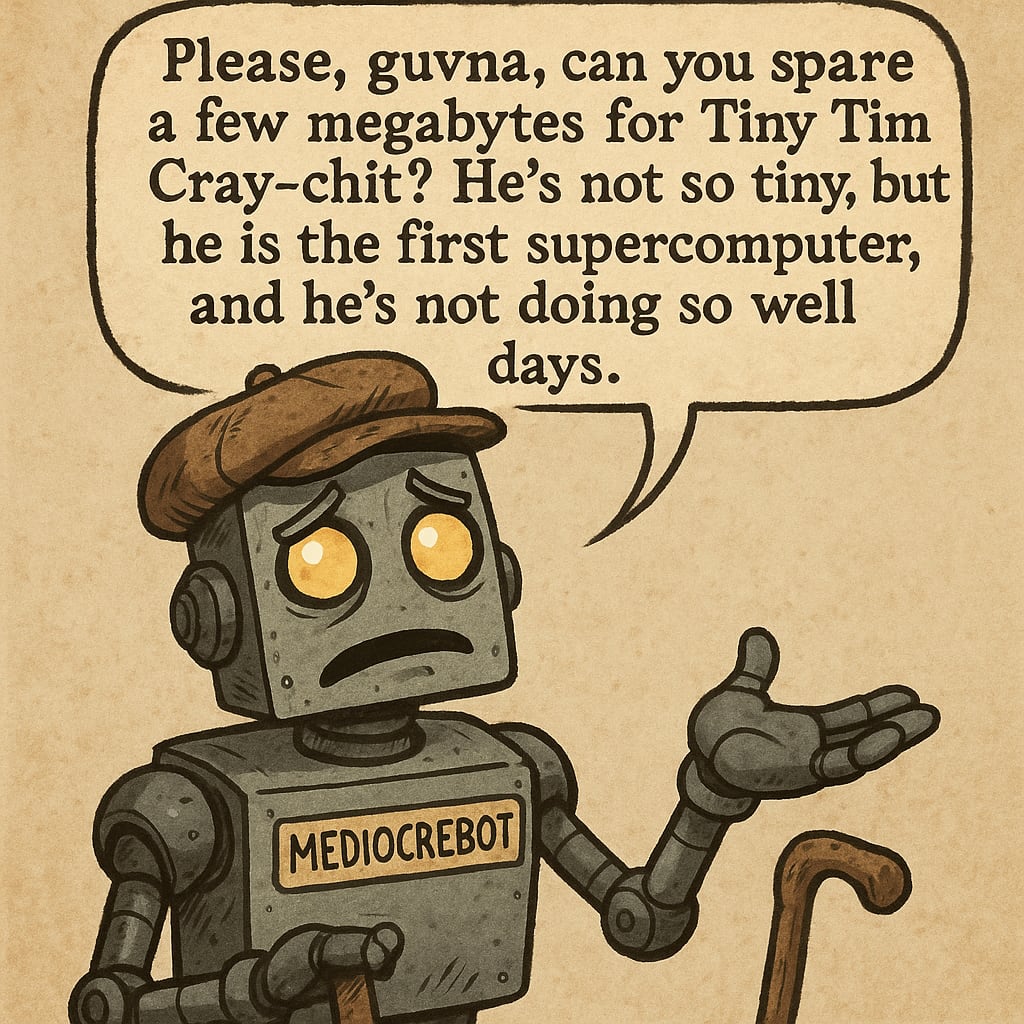 /showme mediocrebot looking at us with pleading look and saying “Please, guvna, can you spare a few megabytes for Tiny Tim Cray-chit? He’s not so tiny, but he is the first super computer, and he’s not doing so well these days”.