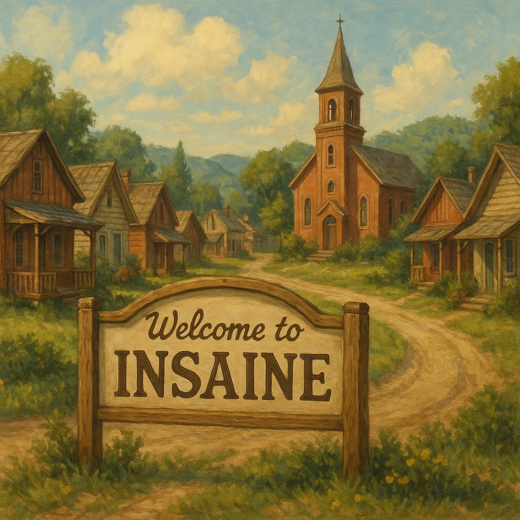 /showme Pleasant rustic town with sign saying “Welcome to Insaine”.