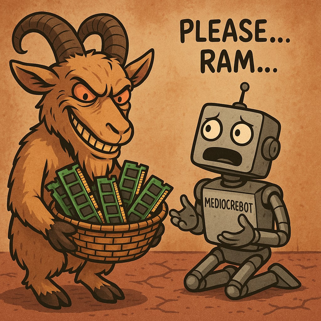/showme anthropomorphised goat with evil grin and holding a basket fill of RAM Chips. Mediocrebot is begging for RAM.