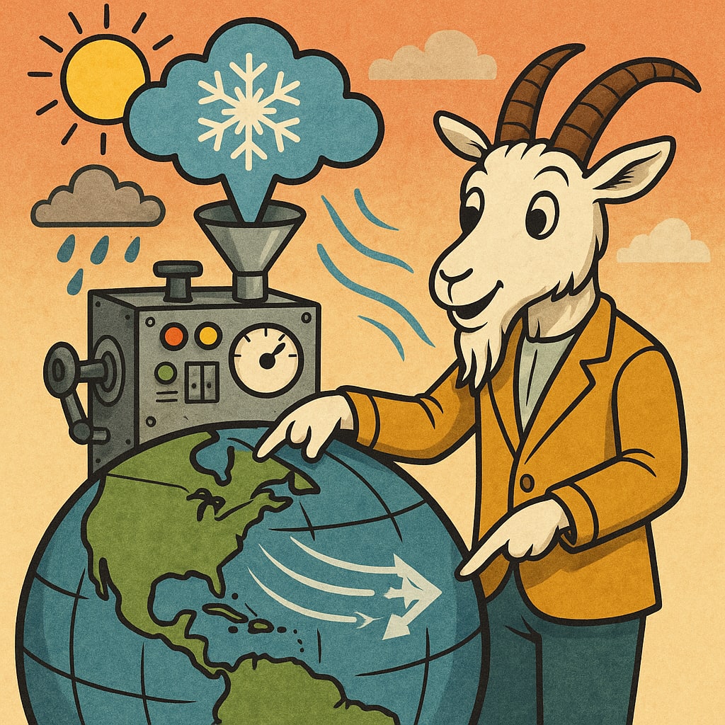 /showme a goat operating a weather machine over a globe and pointing to the south east united states, directing cold weather