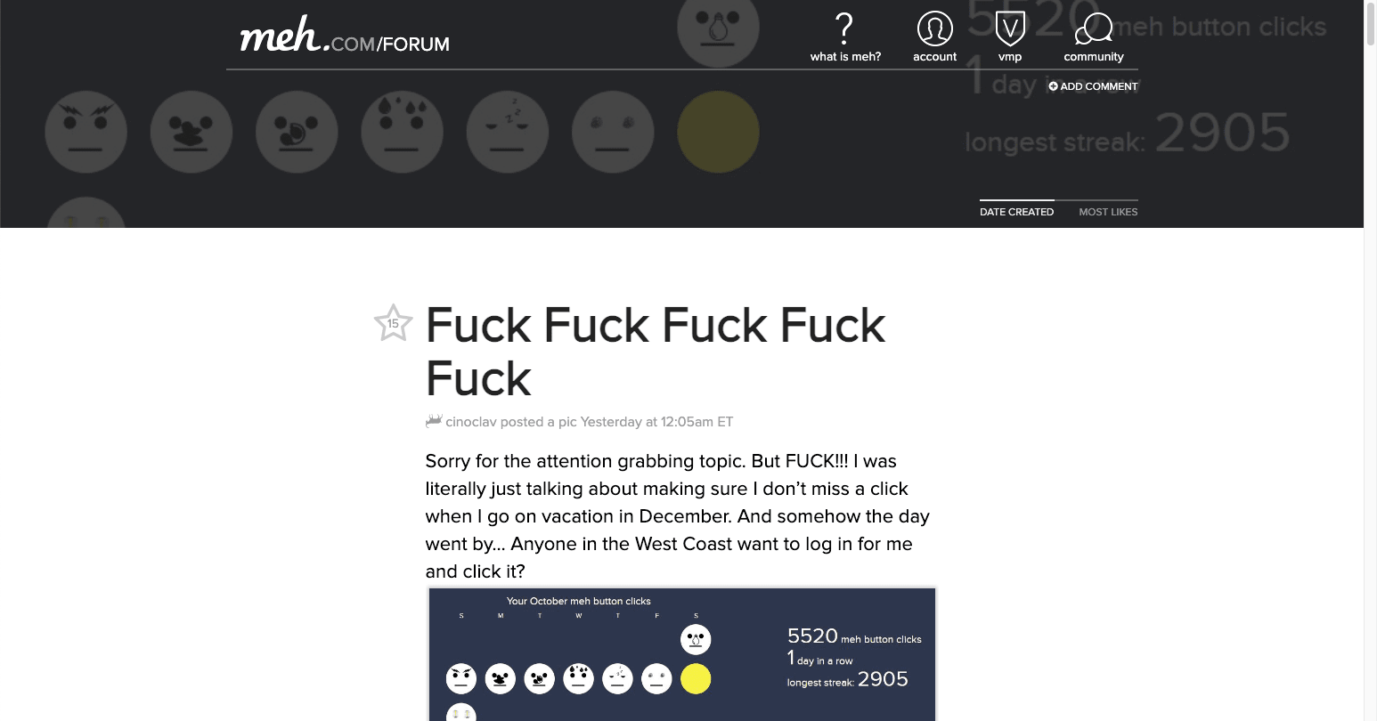 October 25, 2014. I had clicked that mother fucking face for almost 8 straight years. Spent so much time today with my head wrapped around all my other problems in life that the one stupid thing that makes me happy escaped me.