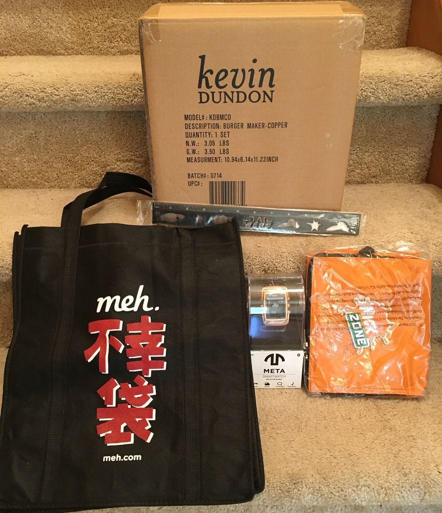 My kids are going to flip over the ET book. They're way too old for it, but they just watched ET for the first time about two weeks ago (it's on Netflix now, yay!) so I think they'll get a kick out of it. The video copter thing may or may not work. It didn't look opened, thought the packaging was a little messed up, so we'll see. I doubt we'll find a use for the lunch bag, I but I love the black tote. Thanks, Meh!