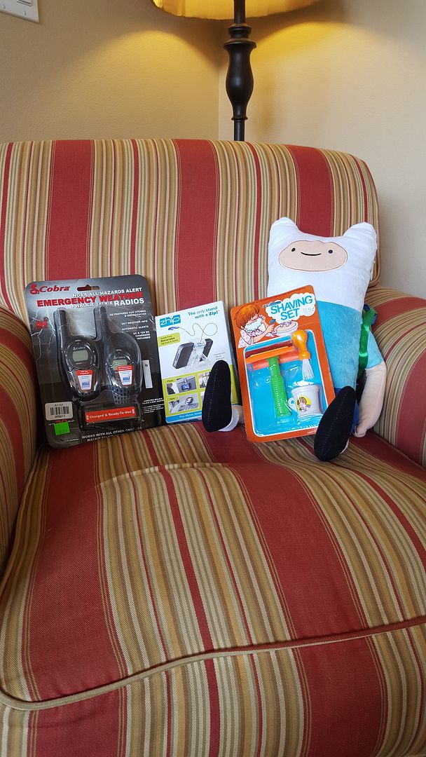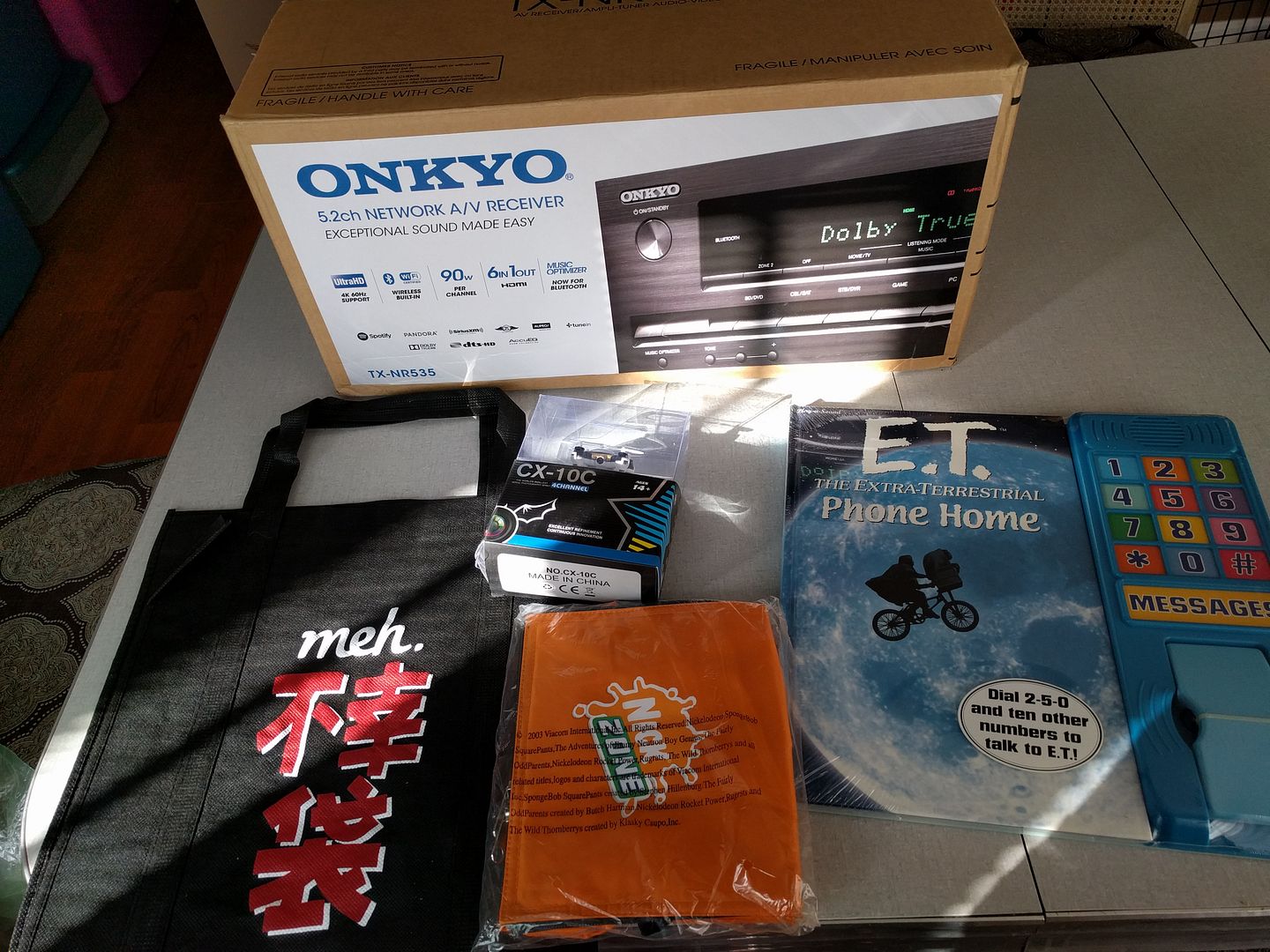 Got mine today... Picture later: Star wars action figure Kevin Dundon Hamburger maker Bluray player with wifi for netflix and other apps Transformers 15 inch laptop sticker Meh black bag