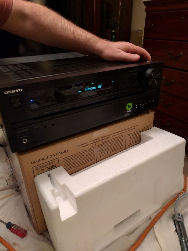 The receiver had a note that said "no sound". When my husband powered it up, the headphone icon was showing. So, I headed to google and he opened it up. We fixed the problem and I paired my phone and we had music. Yay!