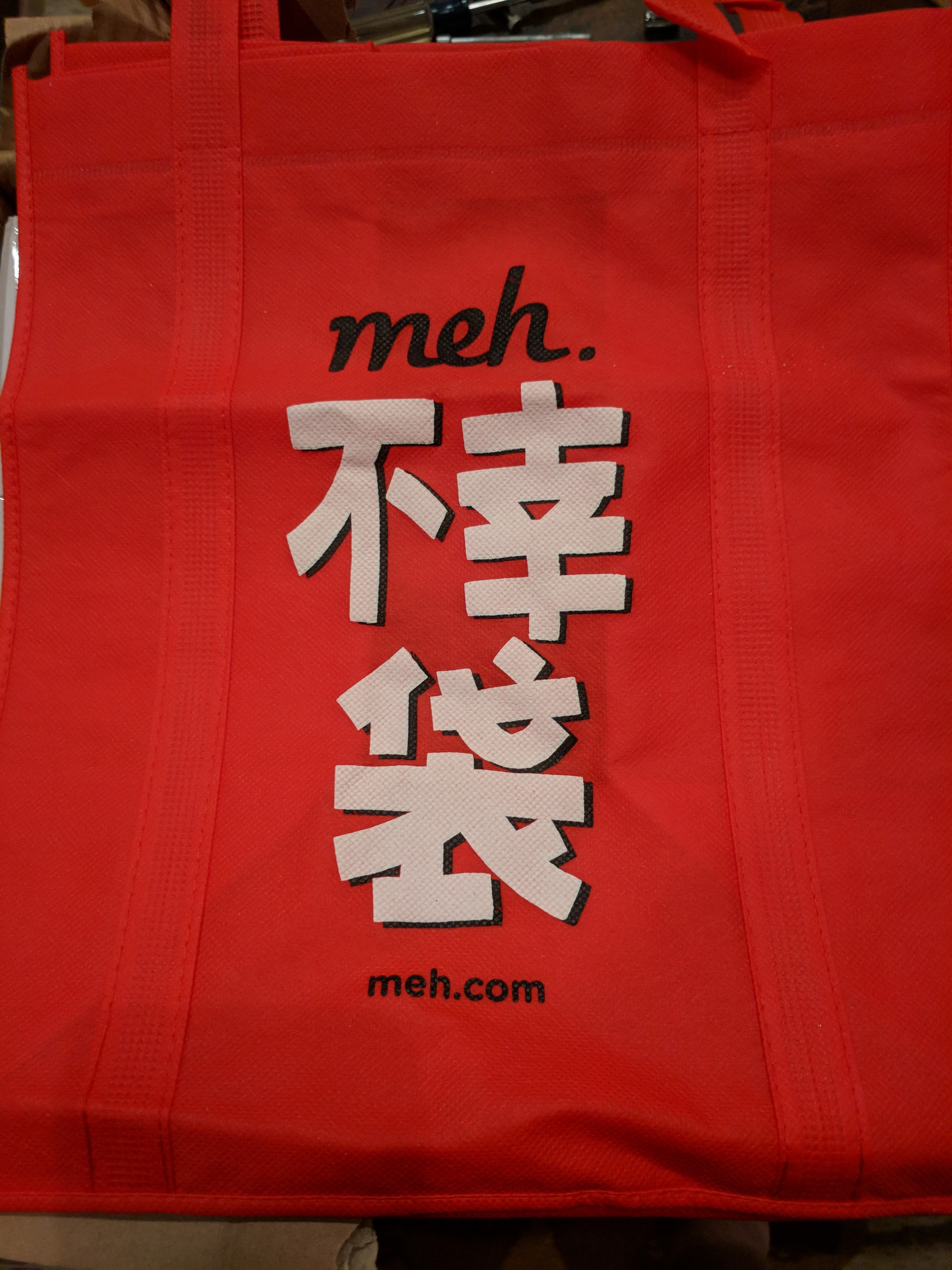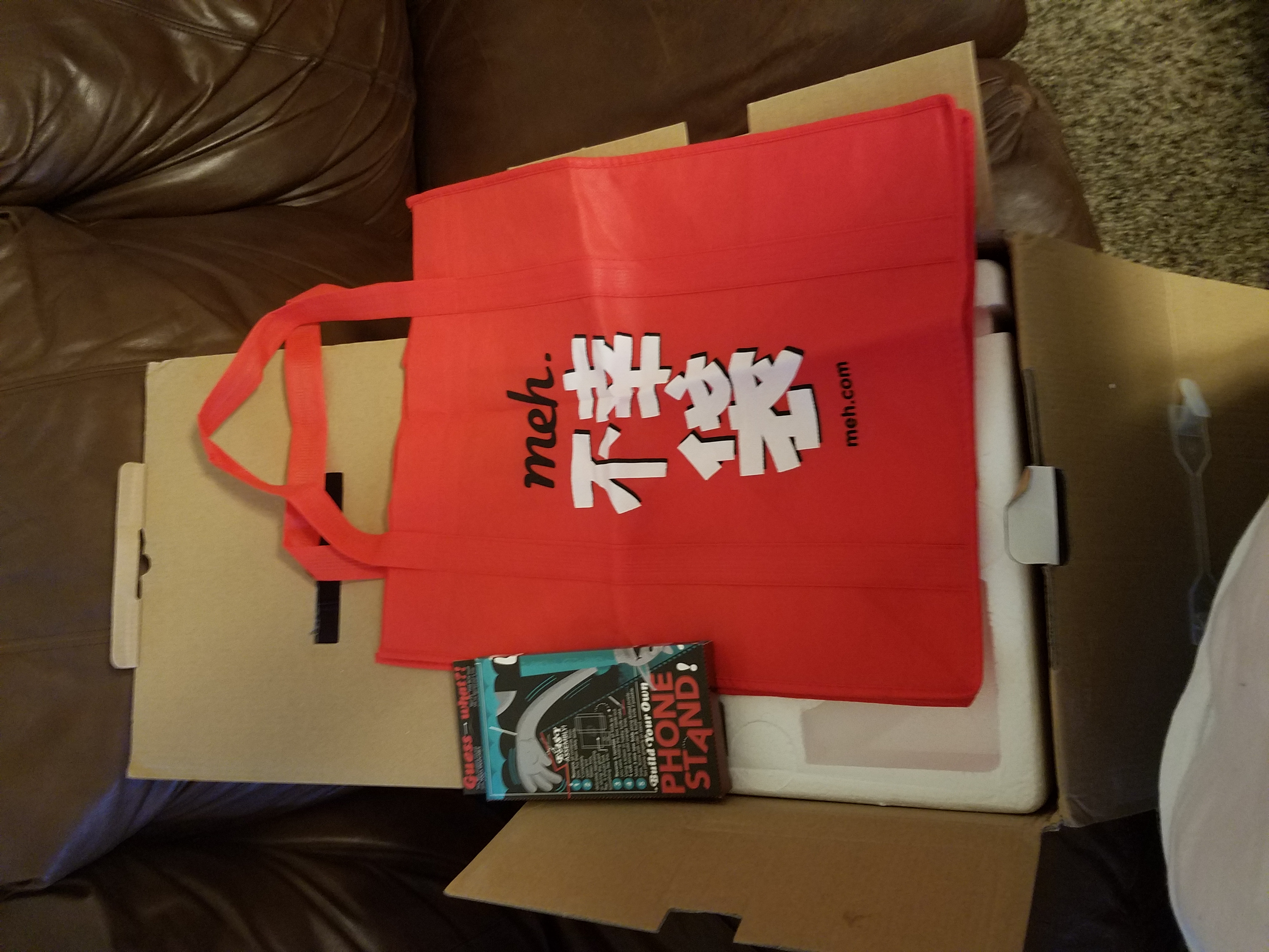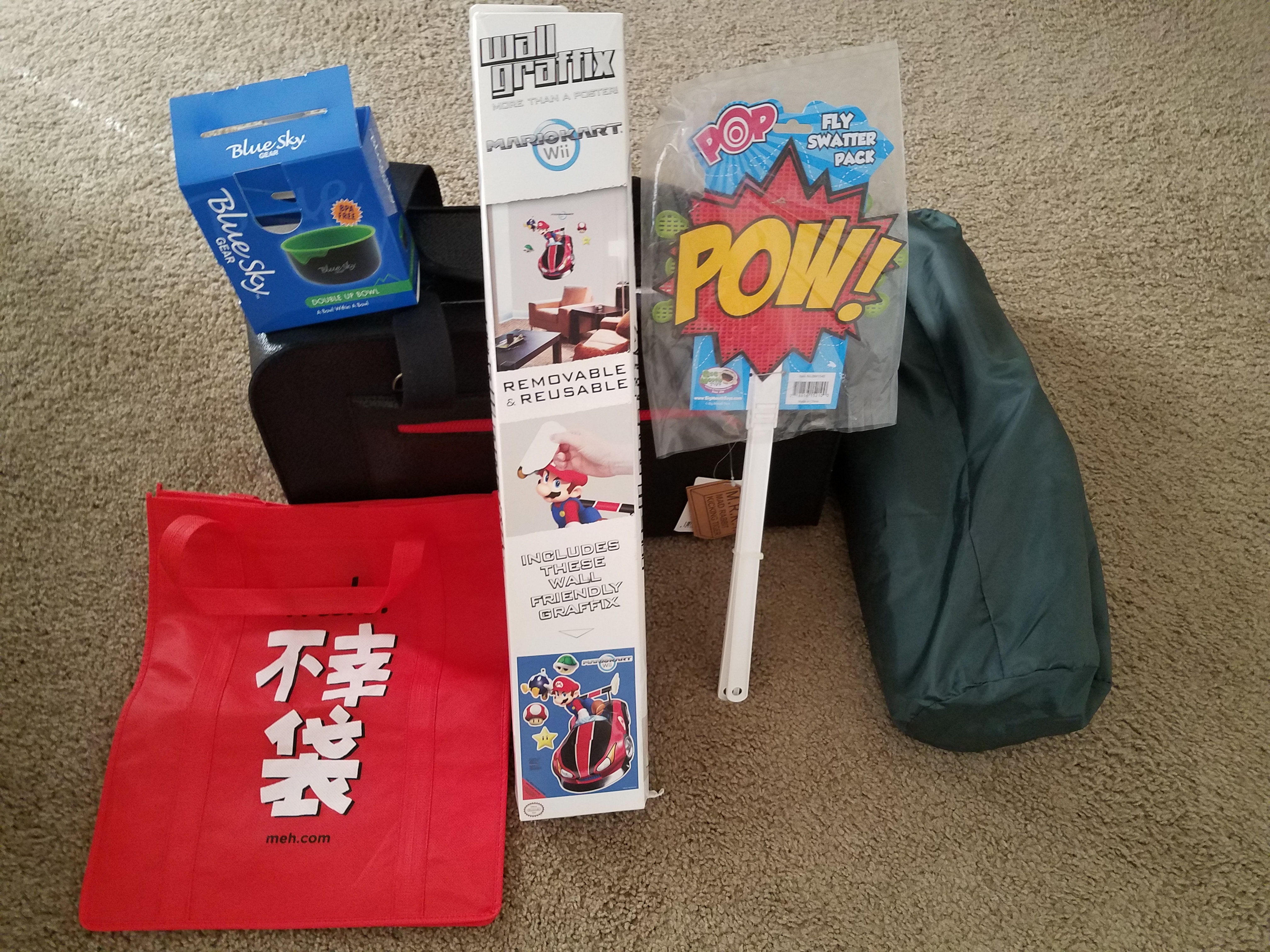 I am disappointed. Got a Ninja Auto-iQ Total Boost Kitchen System with Blender, Food Processor & Cups a red fuko bag and a phone holder. I thought meh would send me some trash that i could complain about. The darn blender even works…sigh. Well thanks meh for making me say yay instead of meh