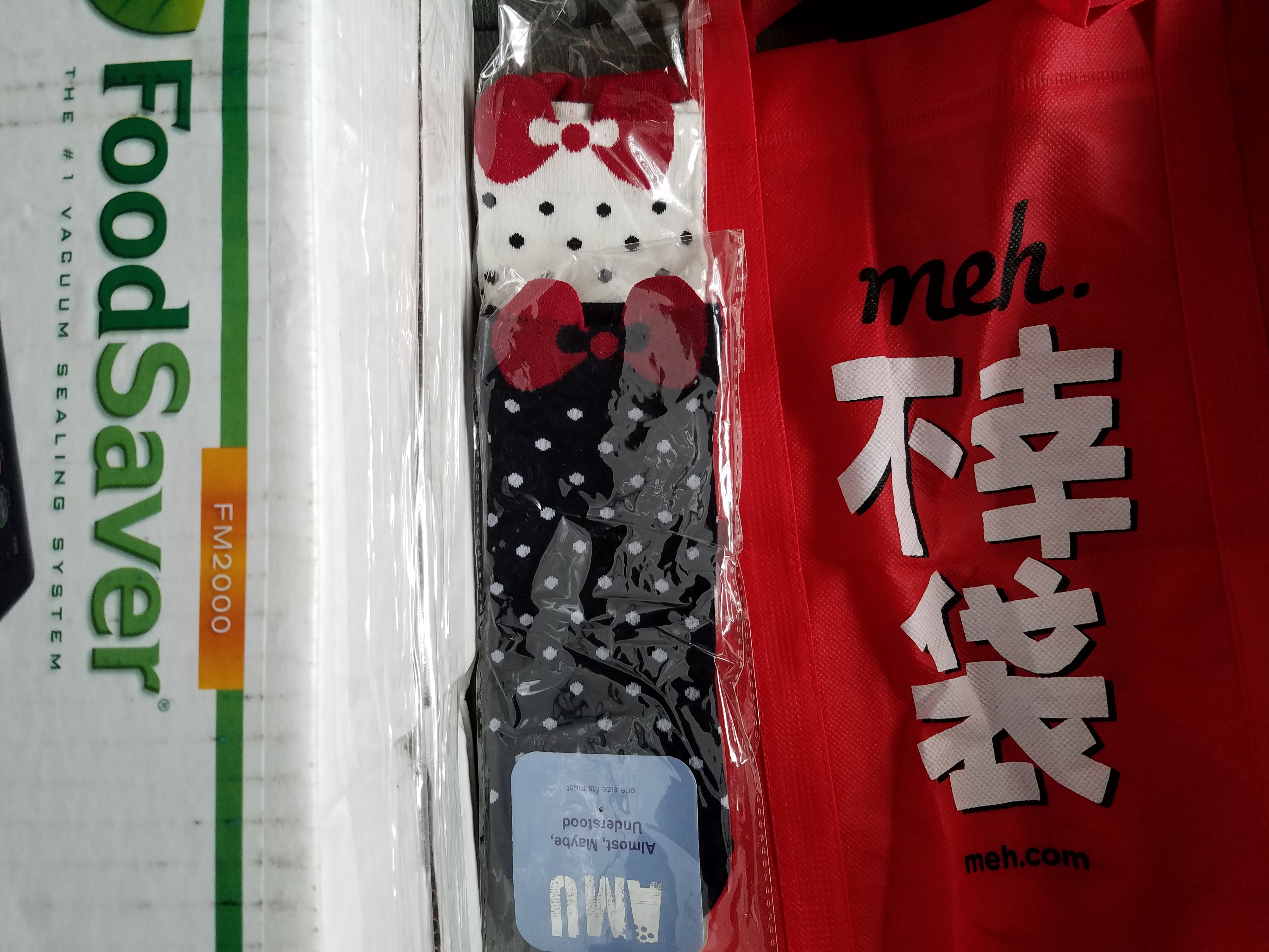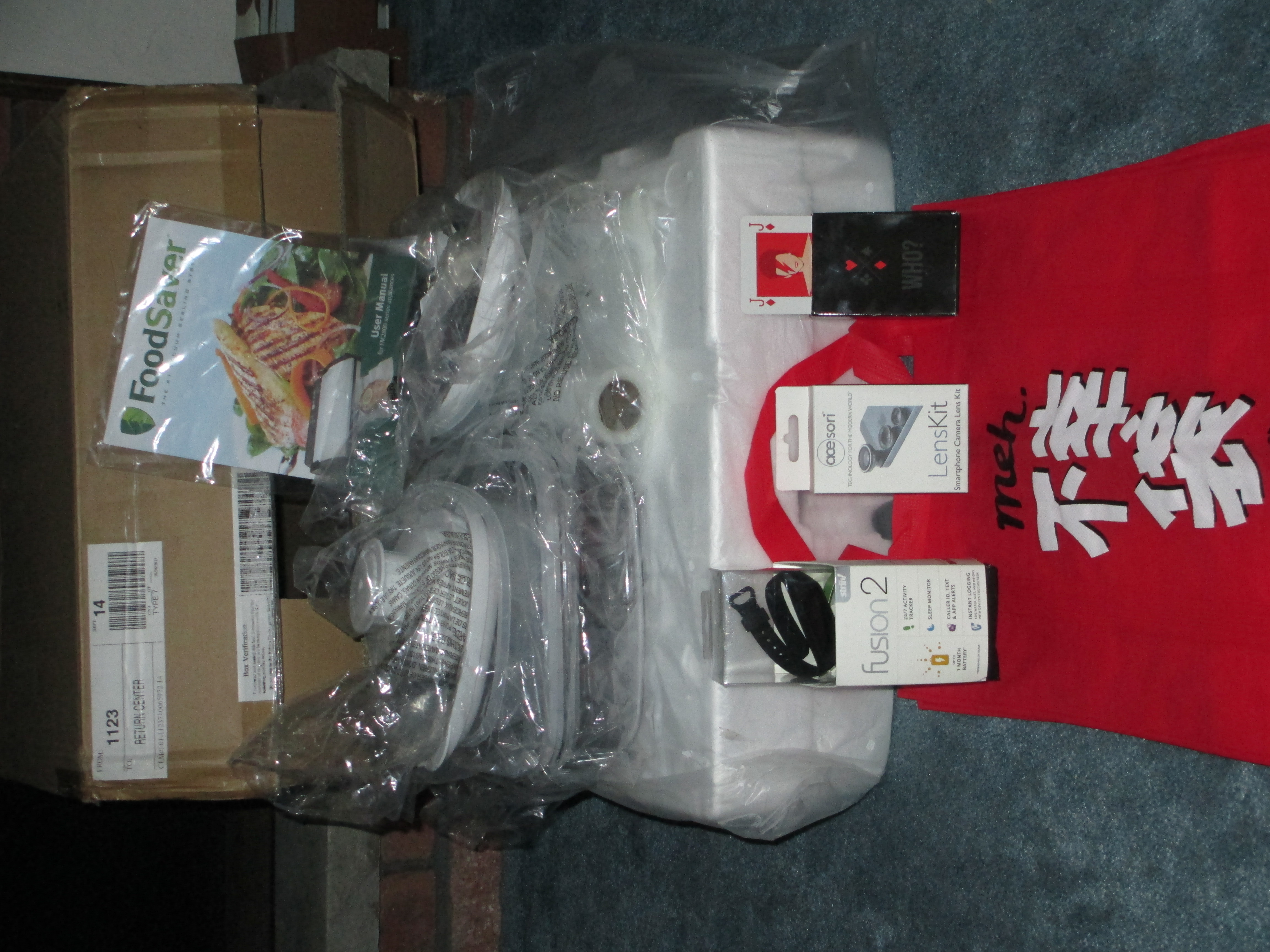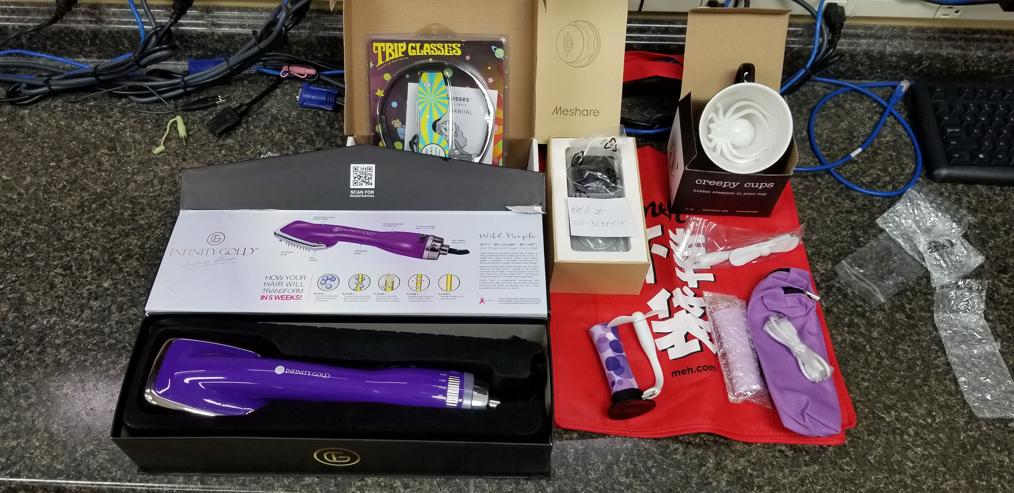 I am disappointed. Got a Ninja Auto-iQ Total Boost Kitchen System with Blender, Food Processor & Cups a red fuko bag and a phone holder. I thought meh would send me some trash that i could complain about. The darn blender even works…sigh. Well thanks meh for making me say yay instead of meh