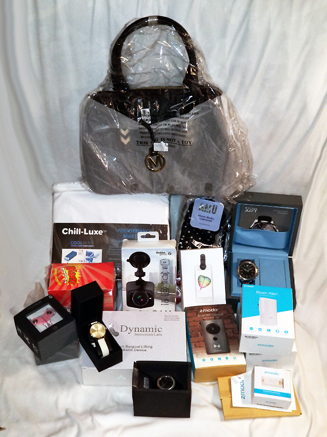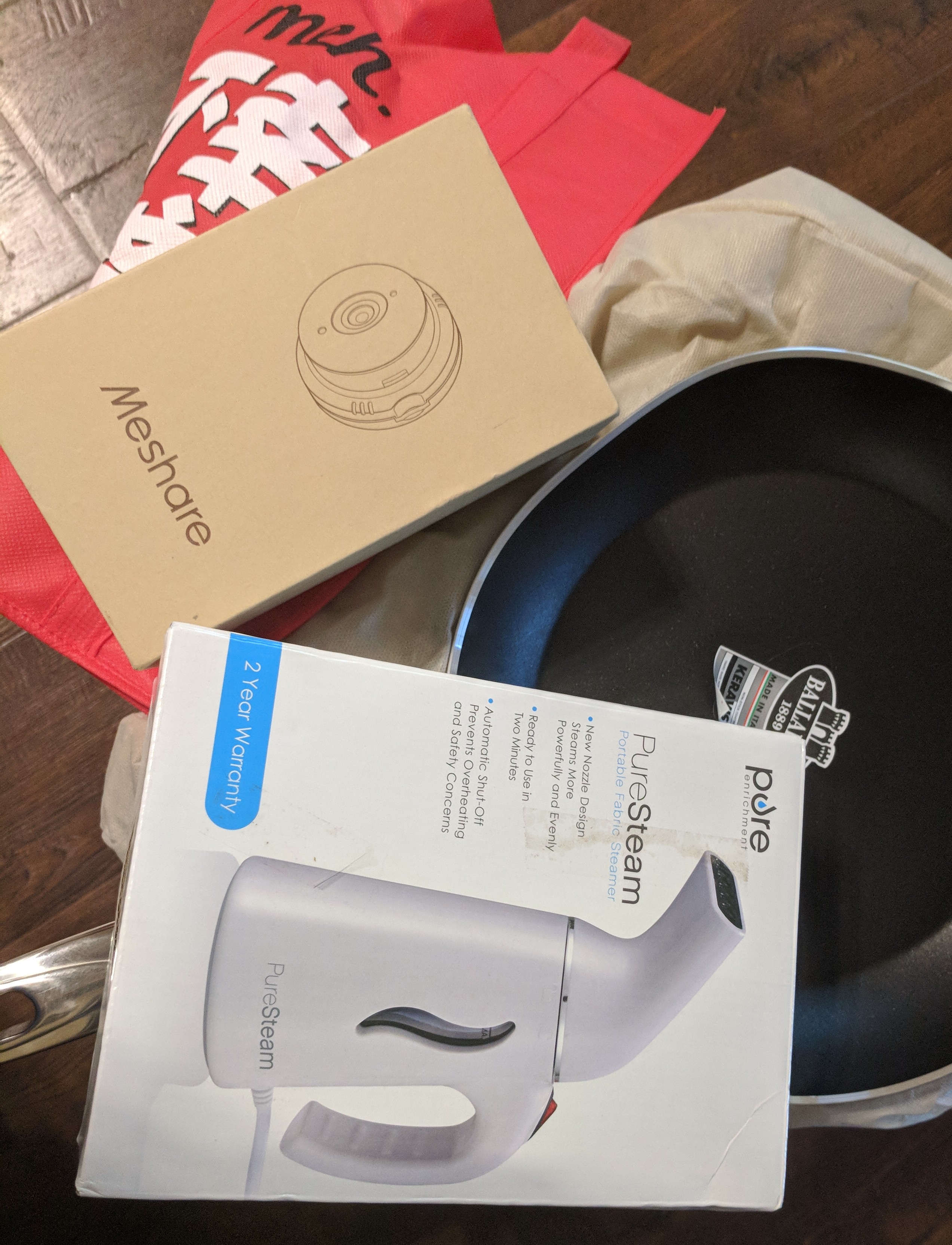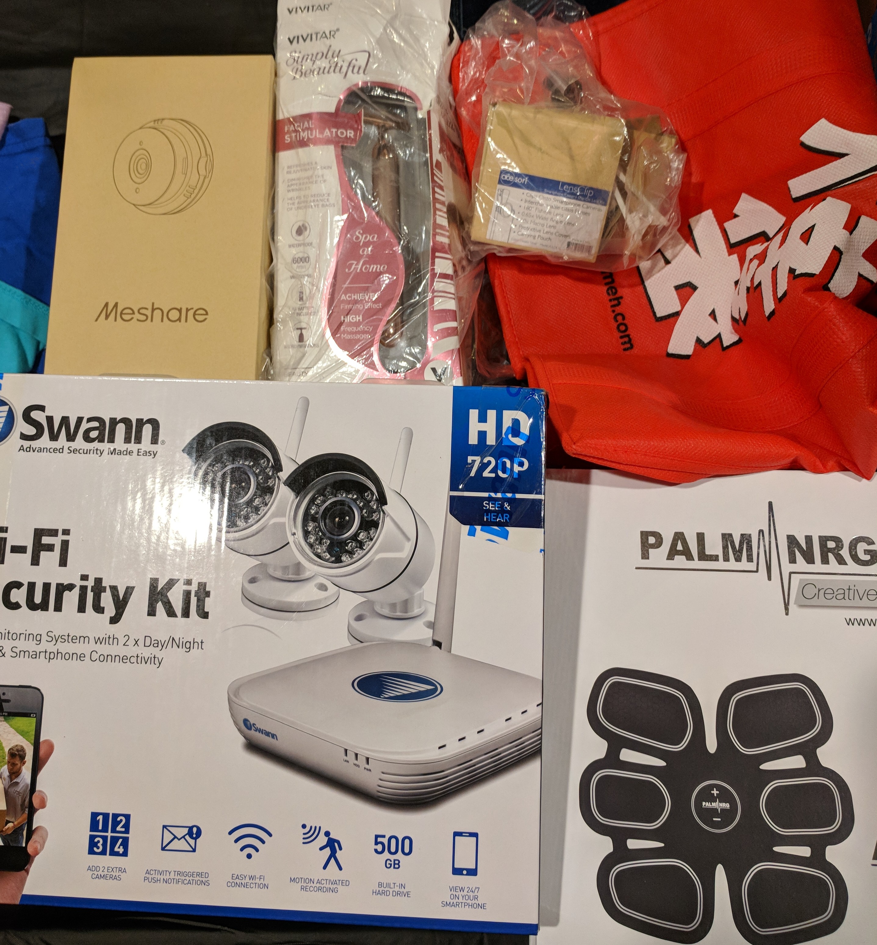 ZMODO - Doorbell - wifi extender - power accessory - king bamboo sheets - Sphero Speaker - socks - Ab Massager? -Zoom phone lens thing. oh and a Foku bag!