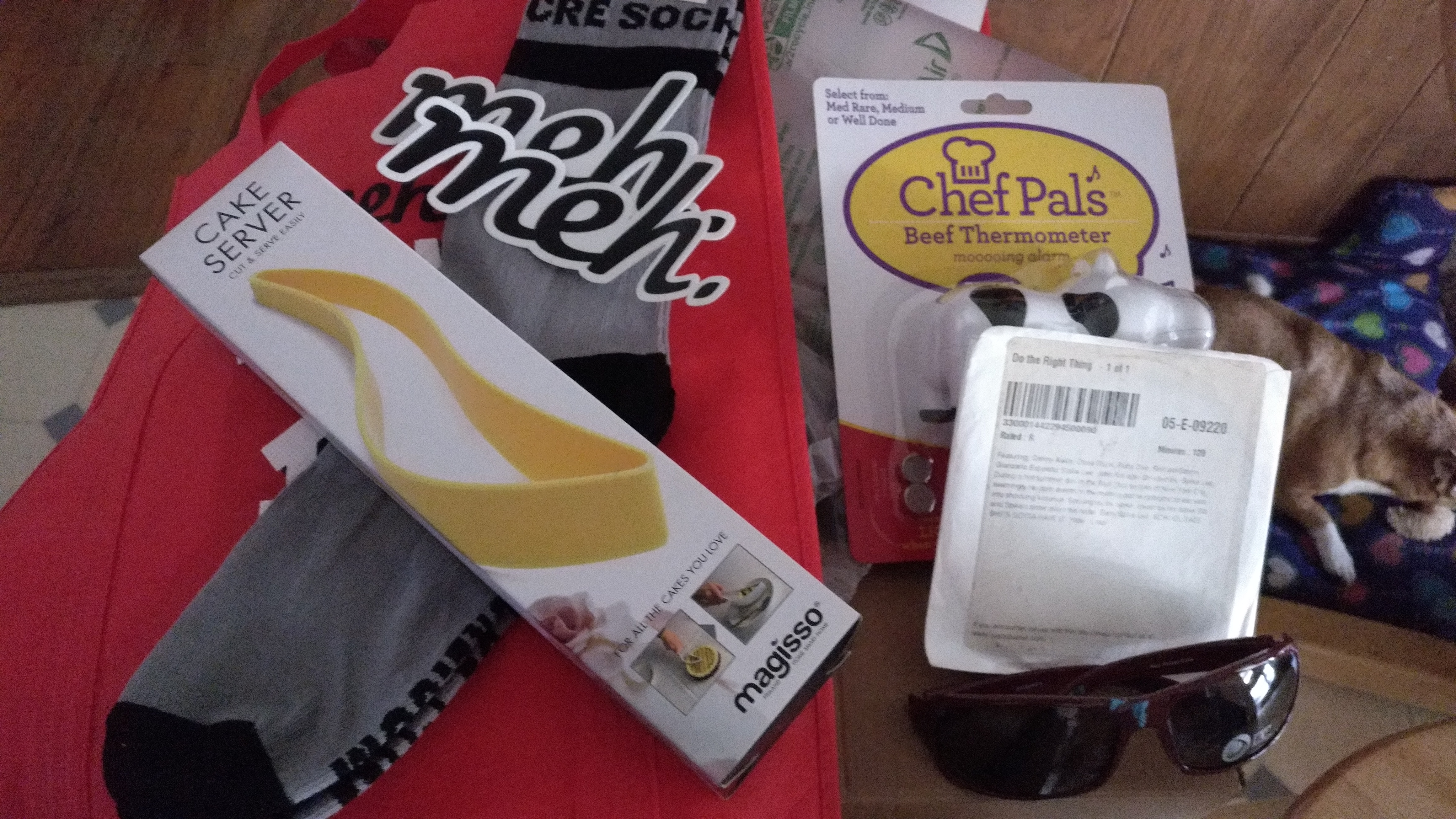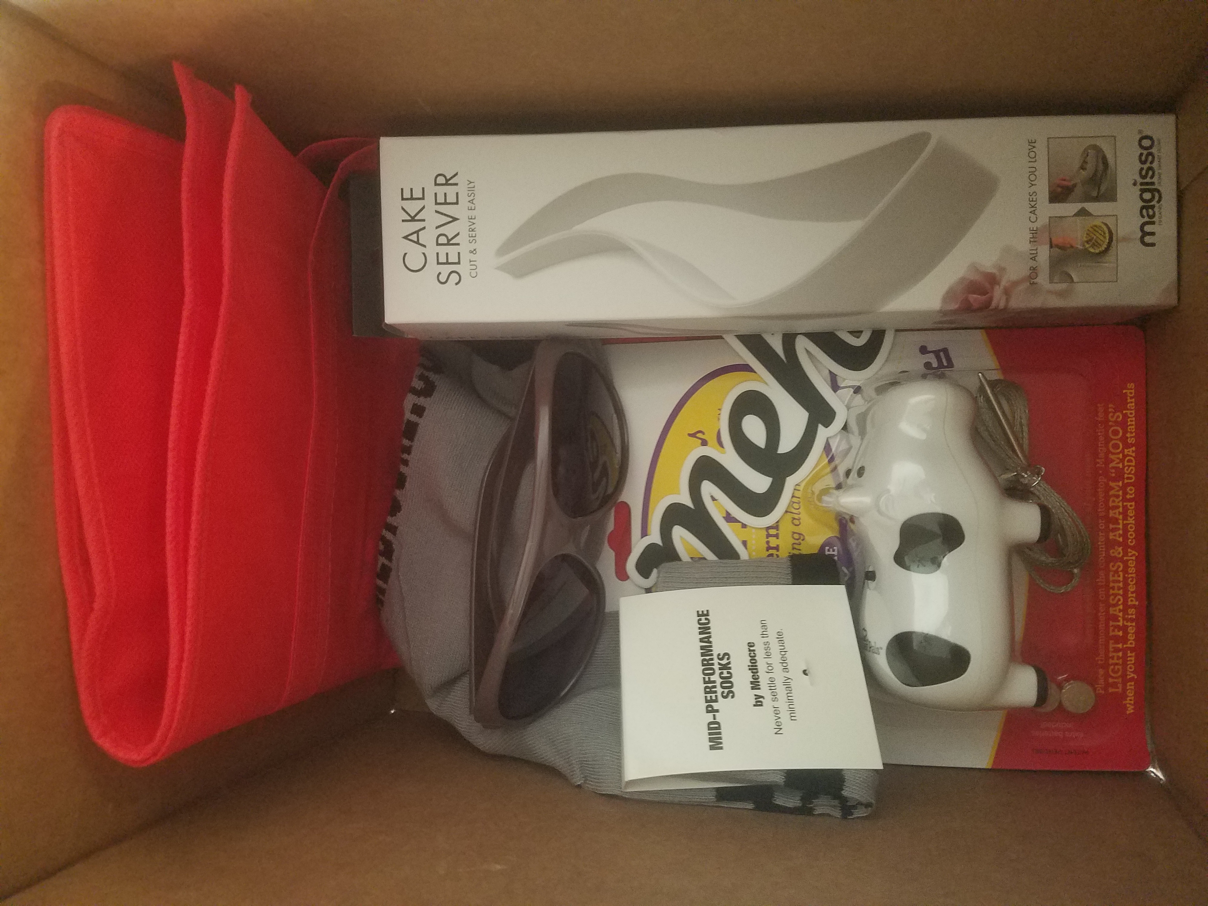 I got mine! 4 purple fuko bags, 1 red fuko bag, mediocre socks, 2 pairs of dirty laundry socks, 2 chef pals beef thermometers, retro spoofs mug, Star Wars Tie fighter, MiGEAR extreme X 1080p wifi action camera, Jabra Supreme, a pair of performance leggings, a beach bag with escape written on it, audio-technica sonicsport in-ear headphones, serious skincare beauty treatment cream, and the 2 items I am stumped by: a ceramic shotglass type thing that was wrapped in a paper towel and looks like an “X” from the bottom and a regular ole pillow in a regular ole grey pillow case. Seems to be right off someone’s bed. I will cherish it always. Great haul with some useful stuff (if it works… Some had handwritten post-it notes with what might be RFA numbers…)I’m thrilled