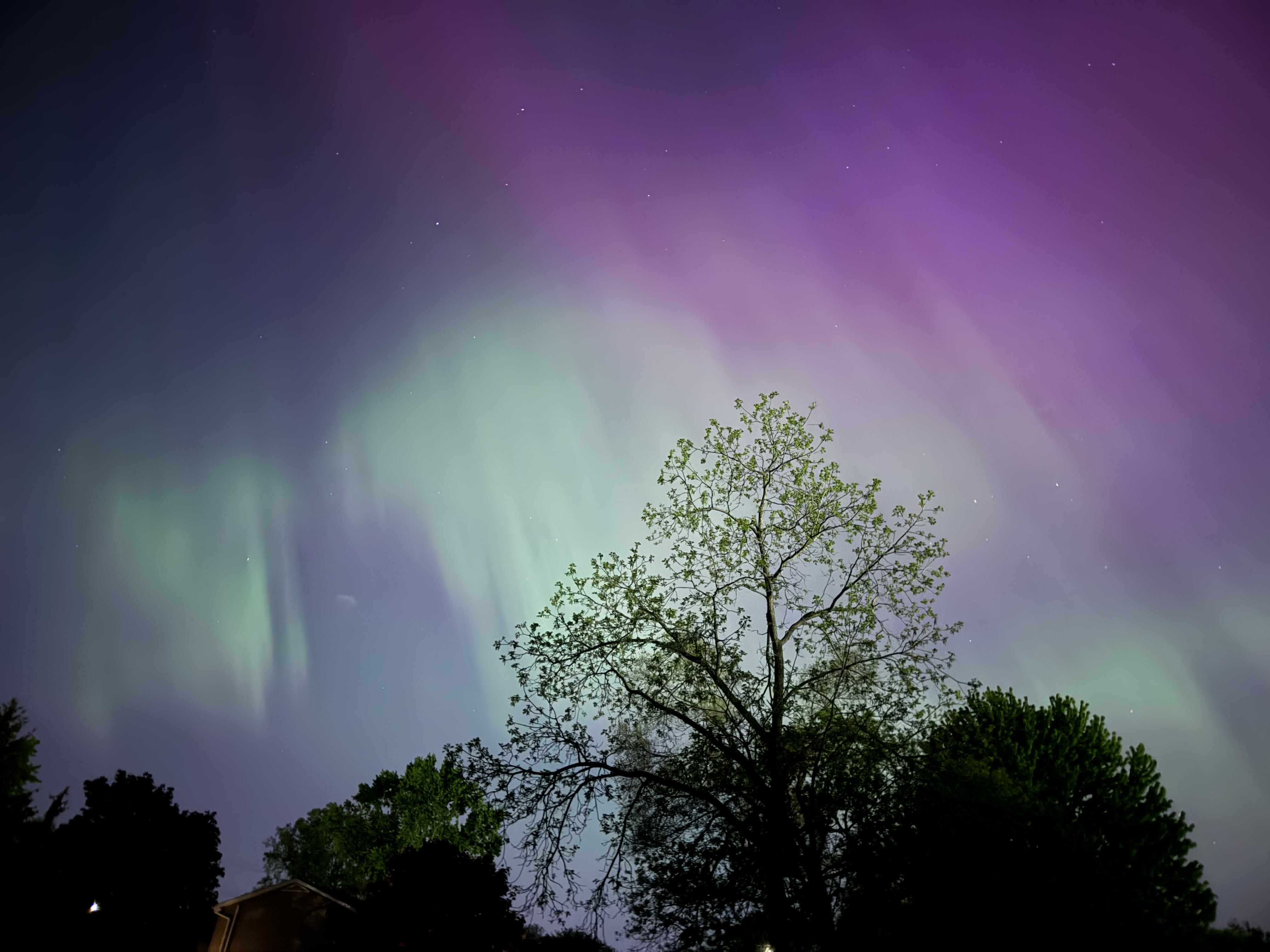 I know everyone’s already flooded with aurora photos, but i’ll post one of mine anyway. this was looking straight up in my driveway. wish i could have zoomed out further. you could see some of the color with naked eye, but this was with the night-sight mode of my phone.