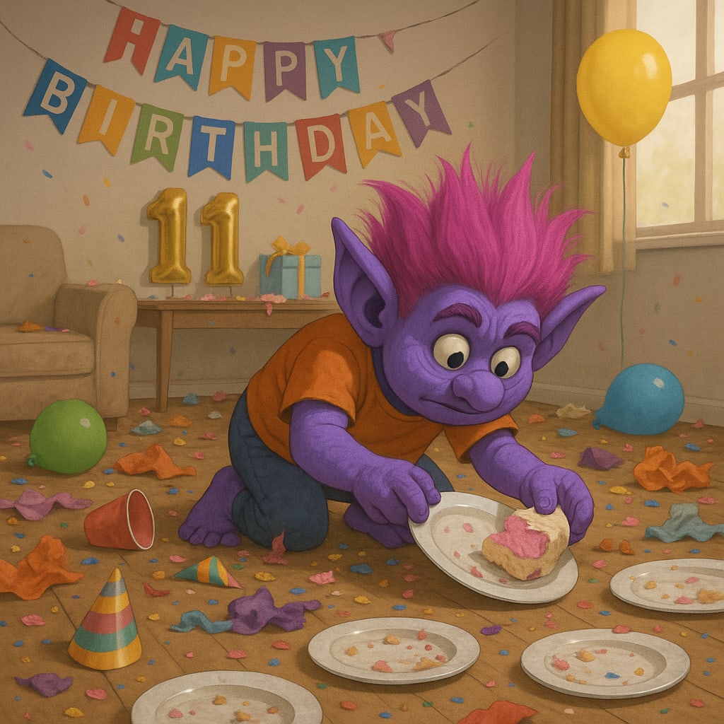 /showme the debris scattered around the room after Meh’s 11th birthday party, with a purple troll in an orange shirt searching through the mess for uneaten cake.