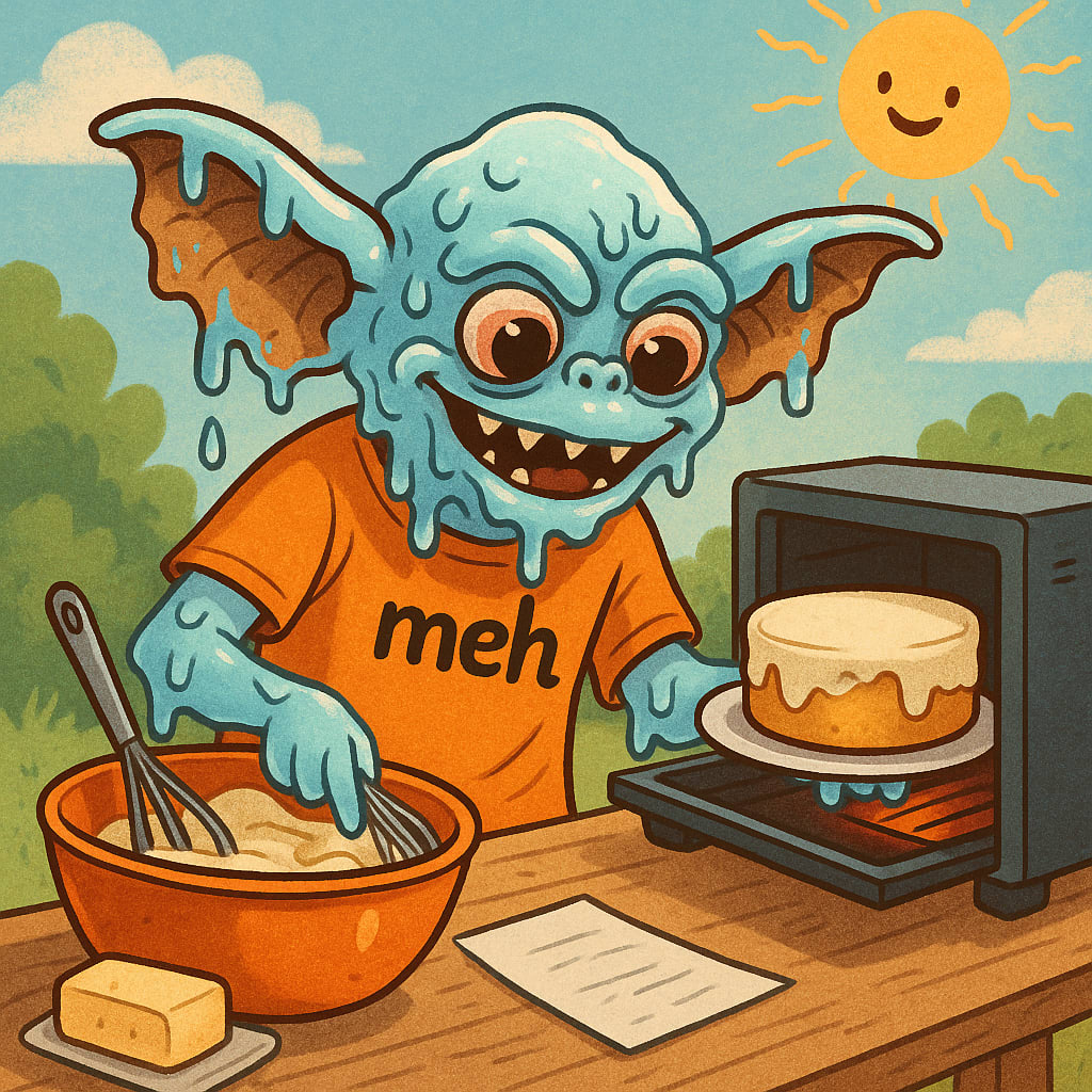 /showme a gremlin made out of ice cream wearing an orange shirt from meh.com outside on a hot summer’s day trying to bake a cake