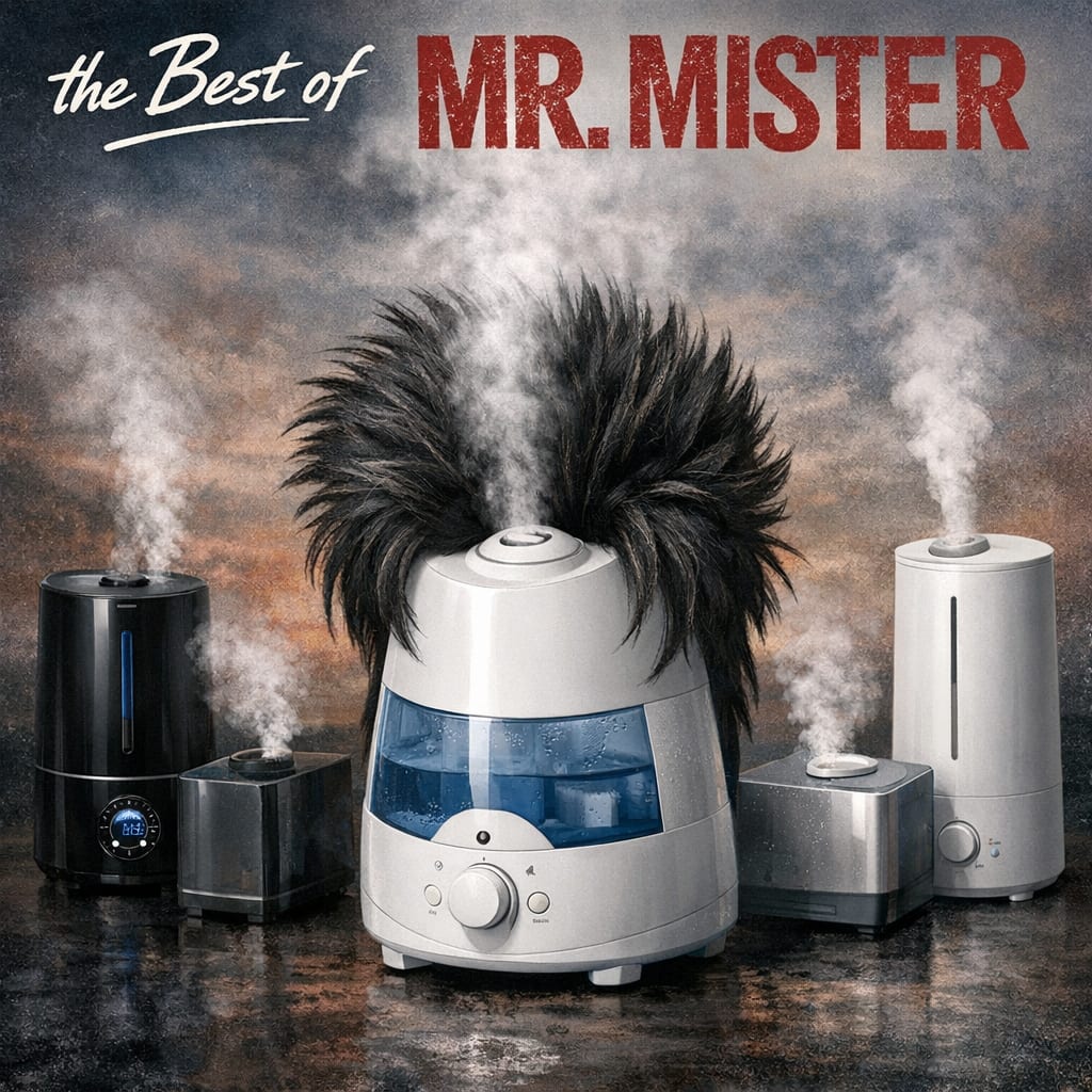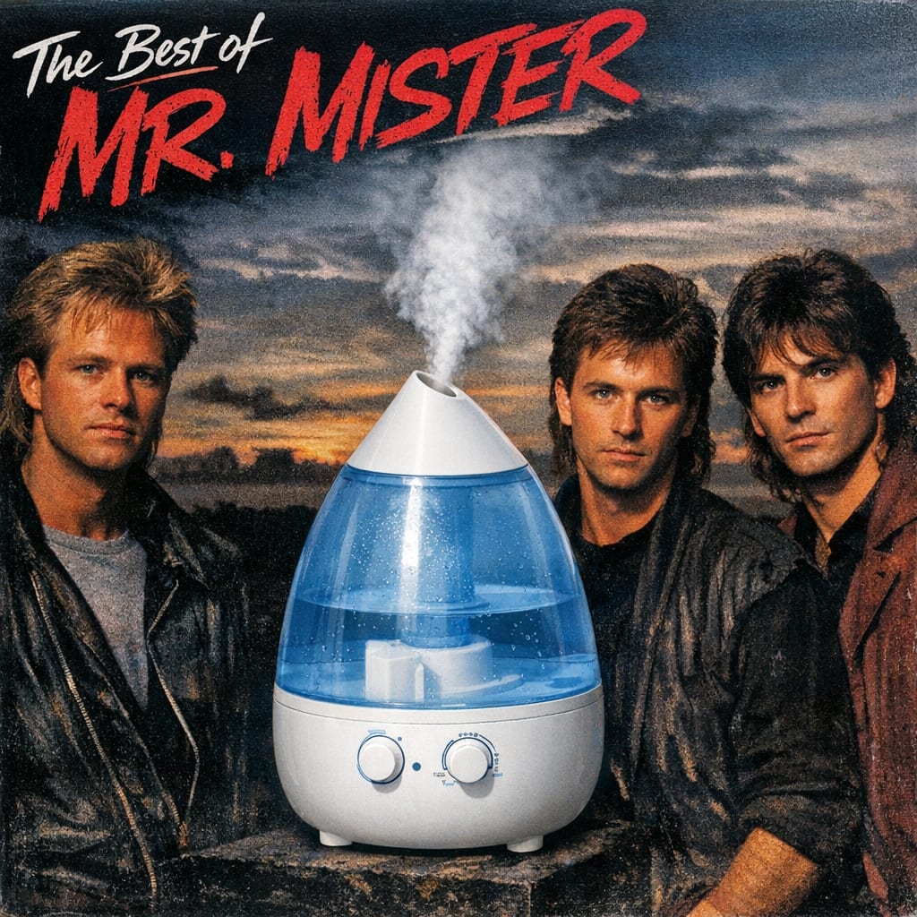 @zippyus Here’s the image you requested for “the album the best of mr. mister, but the guy with big hair is an ultrasonic humidifier”