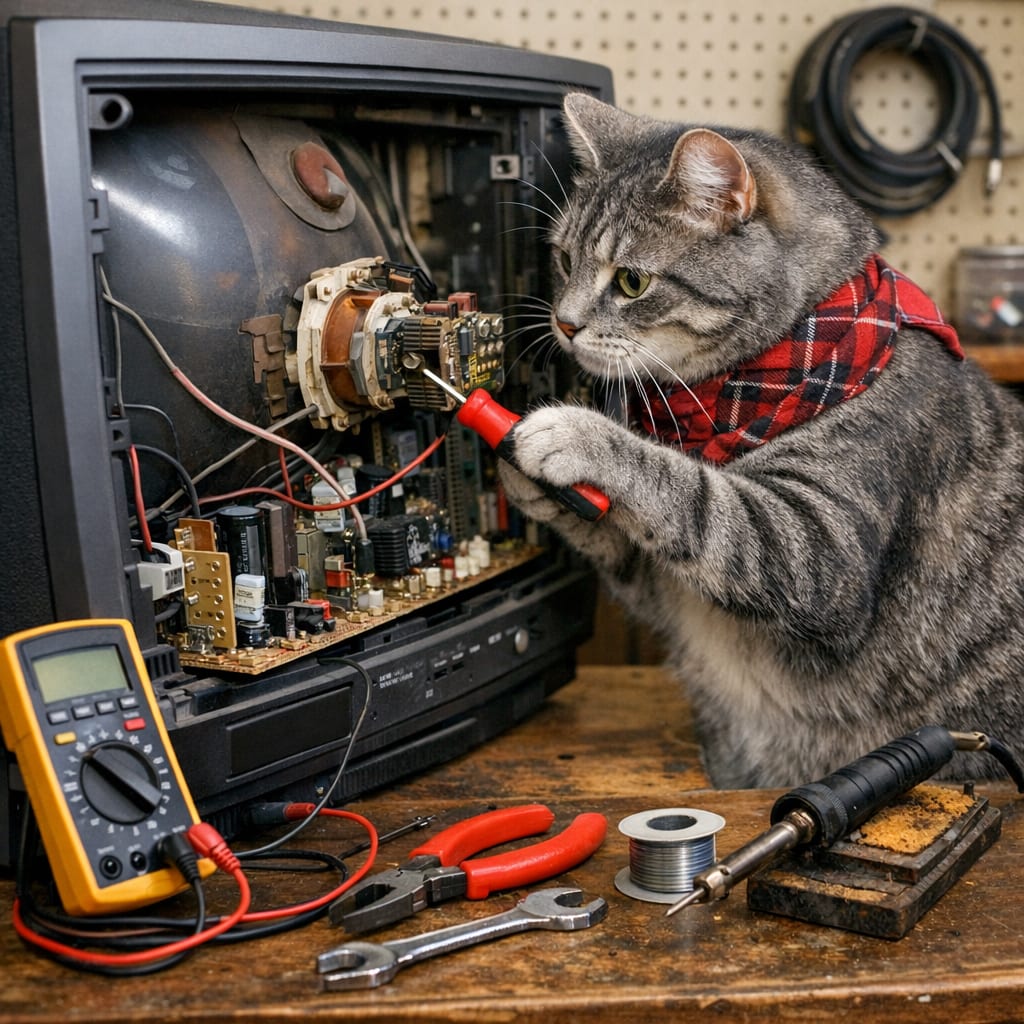 @cfg83 Here’s the image you requested for “Mysti the grey tabby TV repair cat is using tools to fix a television.”