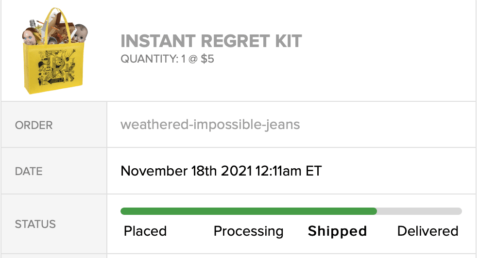 Of course, I had a Meh delivery that took a nice, leisurely detour through Louisiana not long ago (I live on the Fort Worth of DFW. That’s the West side the opposite direction as Louisiana.) So it could be tomorrow, it could be next week or next month…which is next week. Either way, it’s fun to look forward to the revealing of the regret!