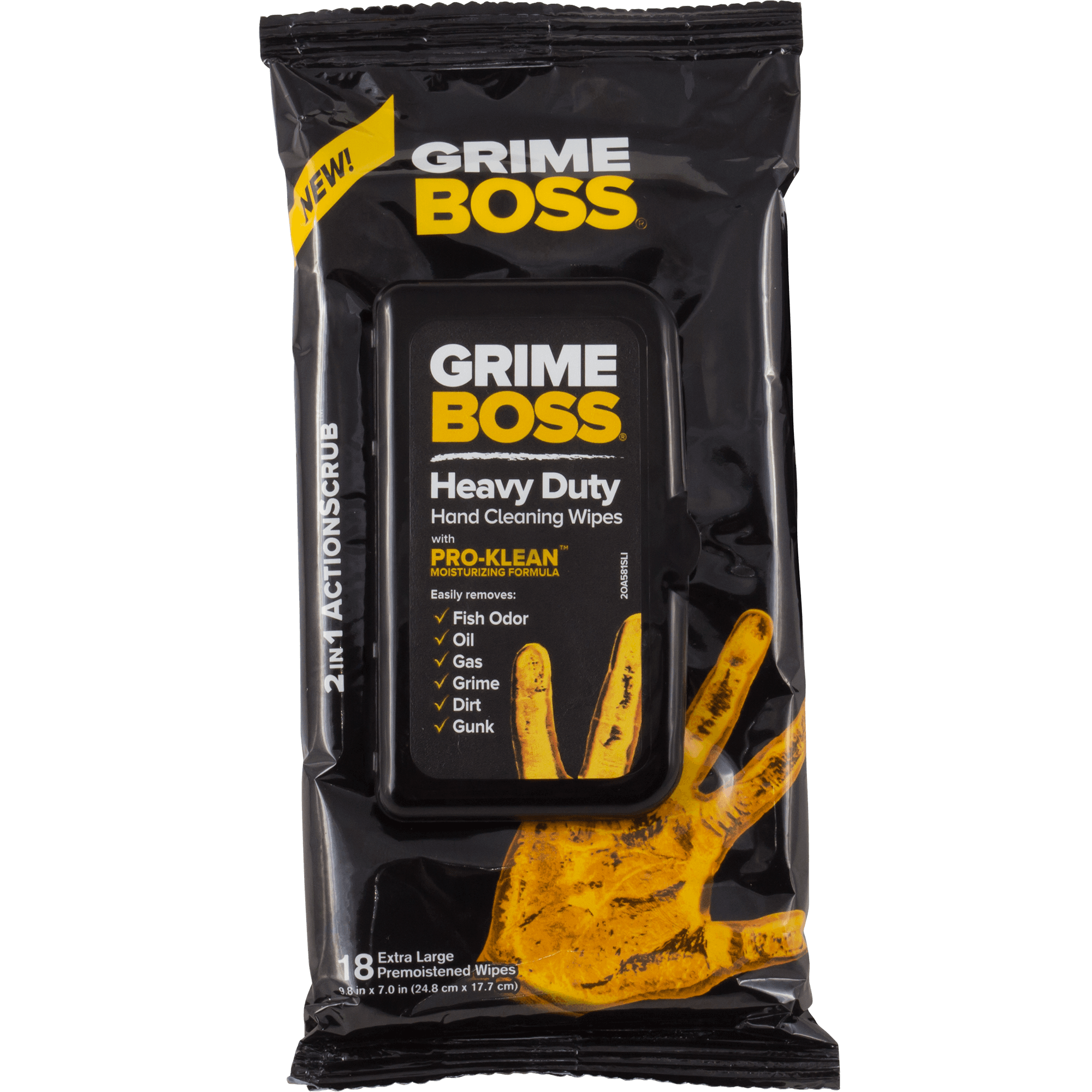 Specs ====- Model: A581S18- 2-in-1 ActionScrub: One smooth side for hands, face, arms, etc. One rough side for scrubbing stuck-on residue- Pro-Klean moisturizing formula penetrates tough messes for a thorough clean- Contains aloe and vitamin E for soft skin- No harsh chemicals- “Clean citrus scent” (pretty antiseptic to be honest but smells better than fish guts and motor oil at least)- Removes most odors- Single pack contains 18 wipes- 16-pack contains two retail boxes containing 8 single packs each, so 16 packs and 288 wipes total- Single package dimensions: 1 x 9.5 x 4.5"- 8-pack box dimensions: 8.5 x 9.5 x 4.75"Condition: New Warranty: 90 Day MediocreEstimated Delivery: 4/1 - 4/3Shipping: $5 or free with VMP What’s in the Box? ====1x 18-count package of Grime Boss wipesor16x 18-count packages of Grime Boss wipesPictures ====Wipes!16 packSingle packWipe scaleI have no mouth and I must cleanPrice Check ====$38.37 at Amazon ($0.13 per wipe)$38.30 at Home Depot ($0.13 per wipe)