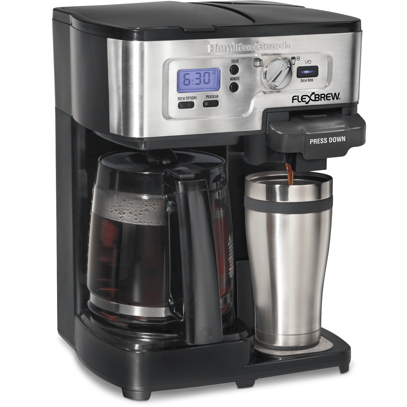 Specs ==== - Model: 49983- Condition: Refurbished- Compatible with K-Cups or ground coffee - Single serve side brews up to 14oz - Adjusts for standard-size mugs or travel mugs - Carafe brews at regular or bold strength - Programmable timer with 2 hour automatic shutoff - Stainless steel and dishwasher safe removable parts - Dimensions: 14 x 10.6 x 10.25" What’s in the Box? ==== 1x Hamilton Beach FlexBrew Coffeemaker 1x Single serve brew basket 1x Glass carafe 1x Instruction Manual Pictures ==== With Travel Mug (not included) With raised coffee cup (also not included) Single serve side works with K-Cups …and grounds Carafe side works with grounds Price Comparison ==== $64.56 (new) at Amazon$89.99 List