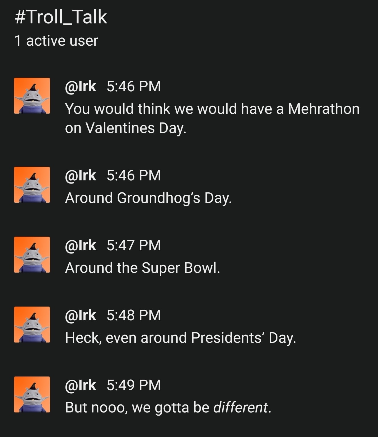 Me. I was sitting here quietly yearning for a mehrathon, and here it is!