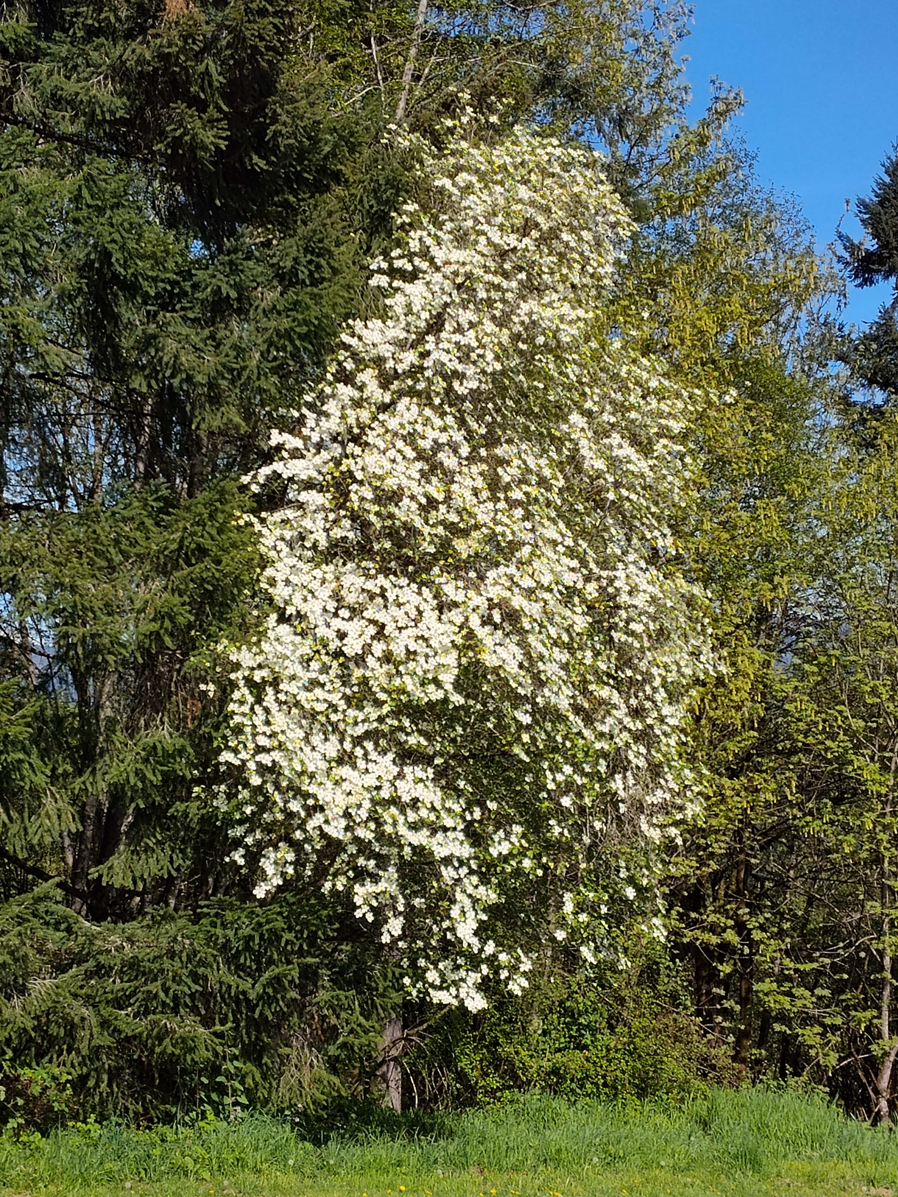 We have a wild flowering dogwood tree that was here when we bought the property. We really haven’t done anything to it, other than removing some other trees/bushes to give the dogwood more room. It has bloomed out this year much more than in the past (we’ve had a wet/warm spring). Not bad for a wild tree.