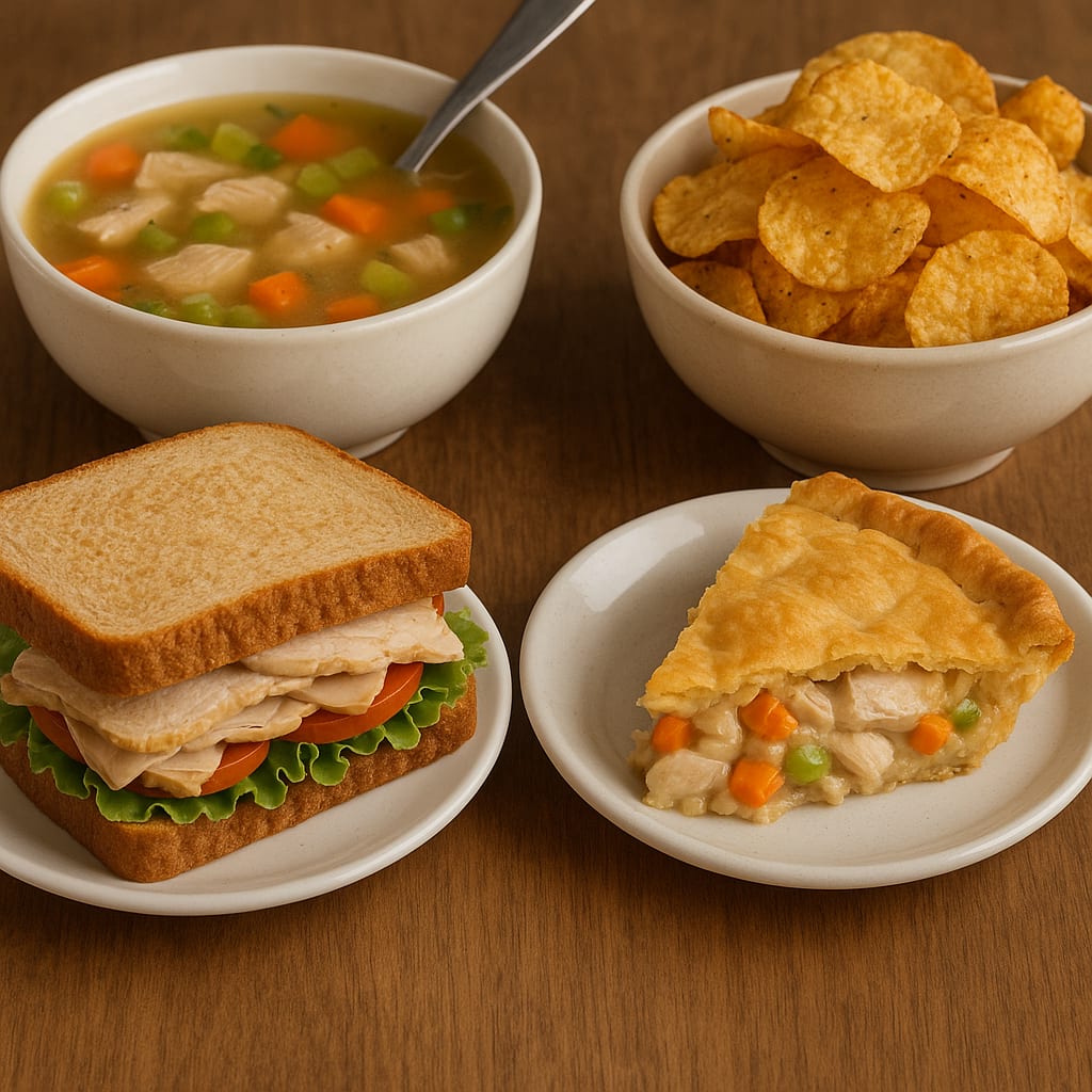 /showme turkey sandwich + turkey pie + turkey soup + turkey chips.